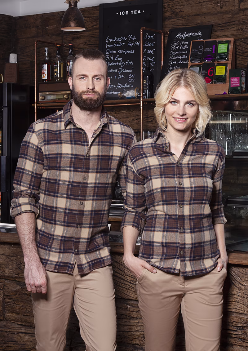 Mit der Damen-Karobluse Urban Trend präsentieren wir Ihnen eine Bluse, die klassische Eleganz mit modernem Streetwear-Charme verbindet. Das dezente Karo-Design in der warmen Farbe Sahara unterstreicht Ihren professionellen Auftritt in Gastronomie, Hotellerie und Wellnessbereichen auf besonders stilvolle Weise.