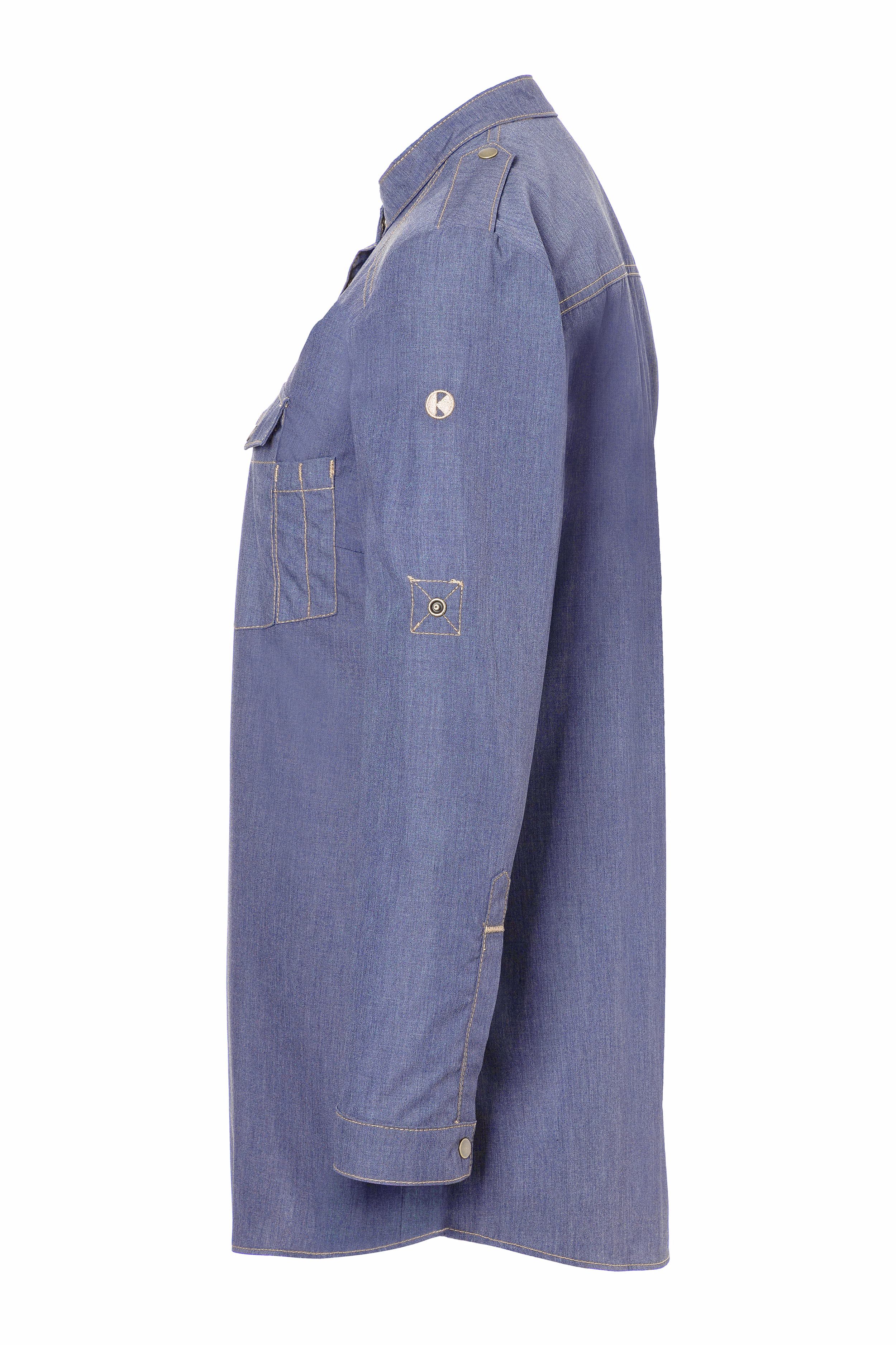 Der modische Stehkragen verleiht dem Kochhemd eine zeitgemäße, professionelle Optik, während kontrastfarbige Steppnähte den typischen Jeans-Charakter unterstreichen. Der Zierriegel an den Schultern setzt weitere stilvolle Akzente und sorgt für ein markantes Erscheinungsbild, das Ihr Team souverän repräsentiert. Die Ärmel lassen sich dank zusätzlicher Befestigungsriegel unkompliziert krempeln und fixieren – so bleiben Sie auch bei viel Bewegung stets komfortabel gekleidet.