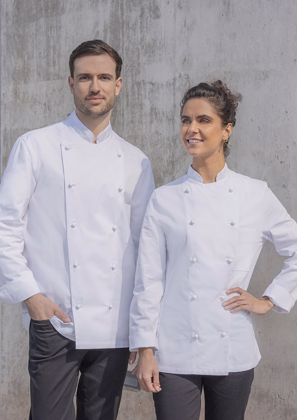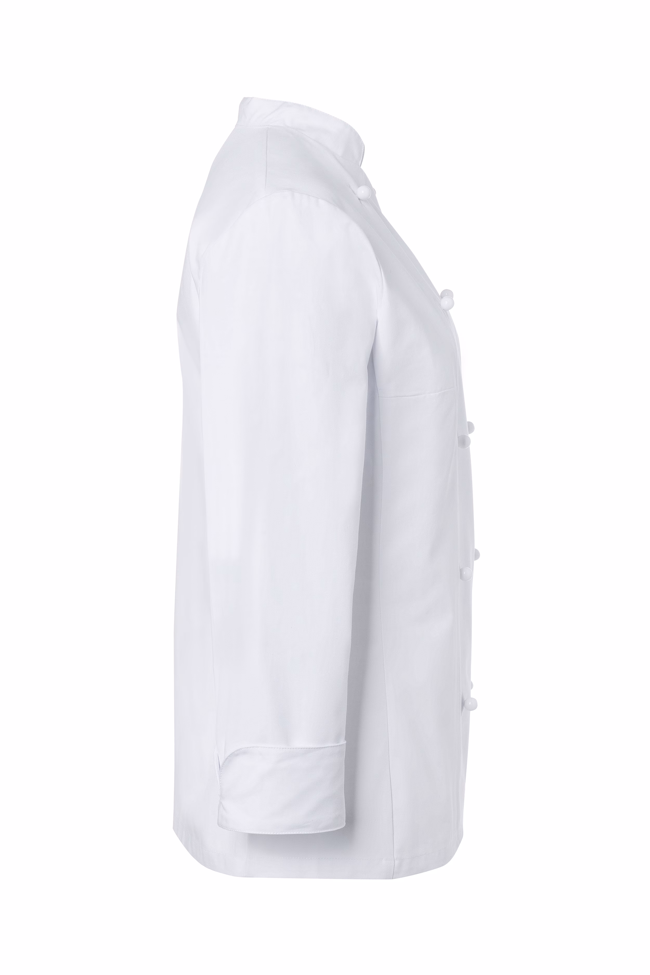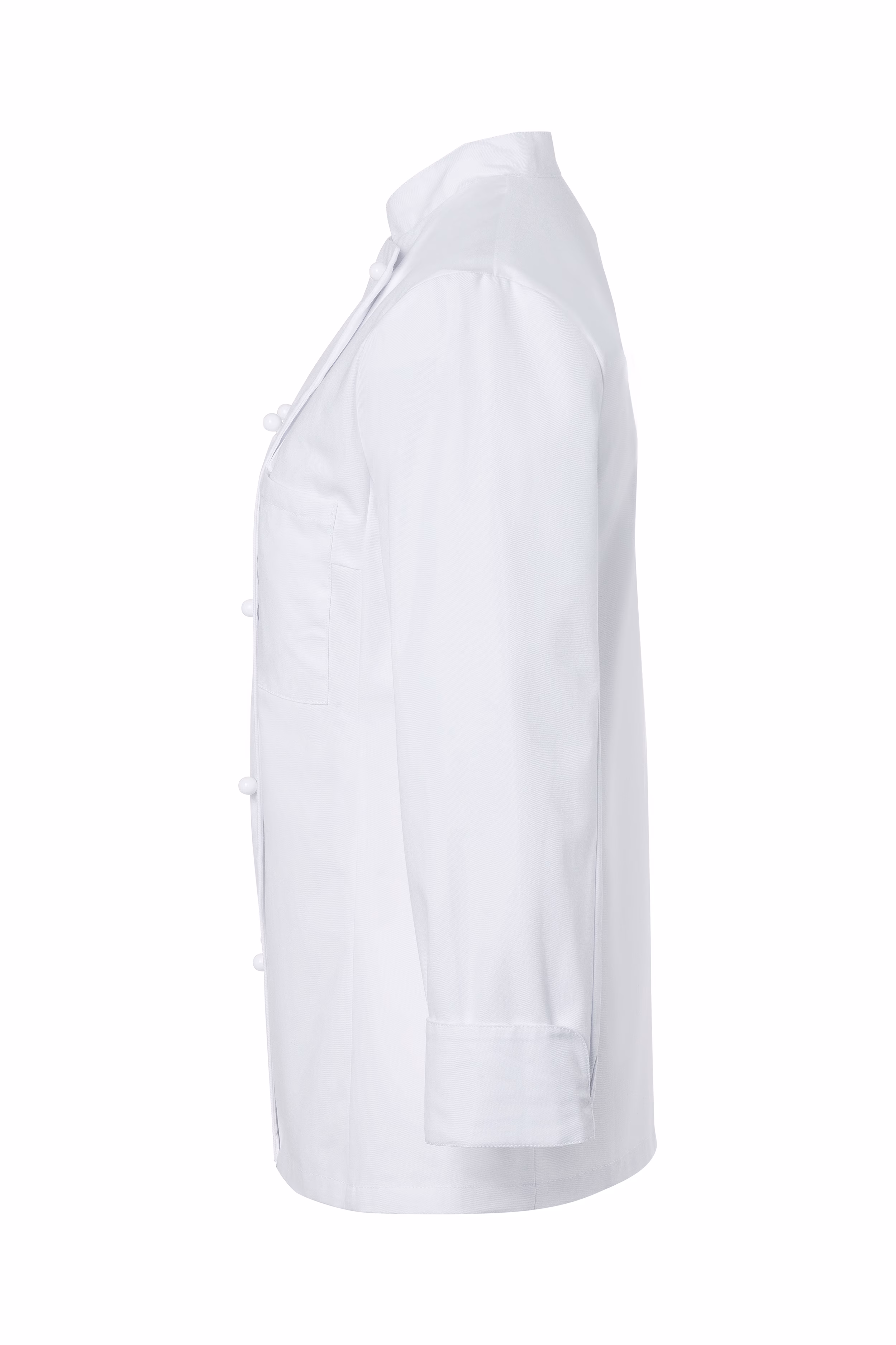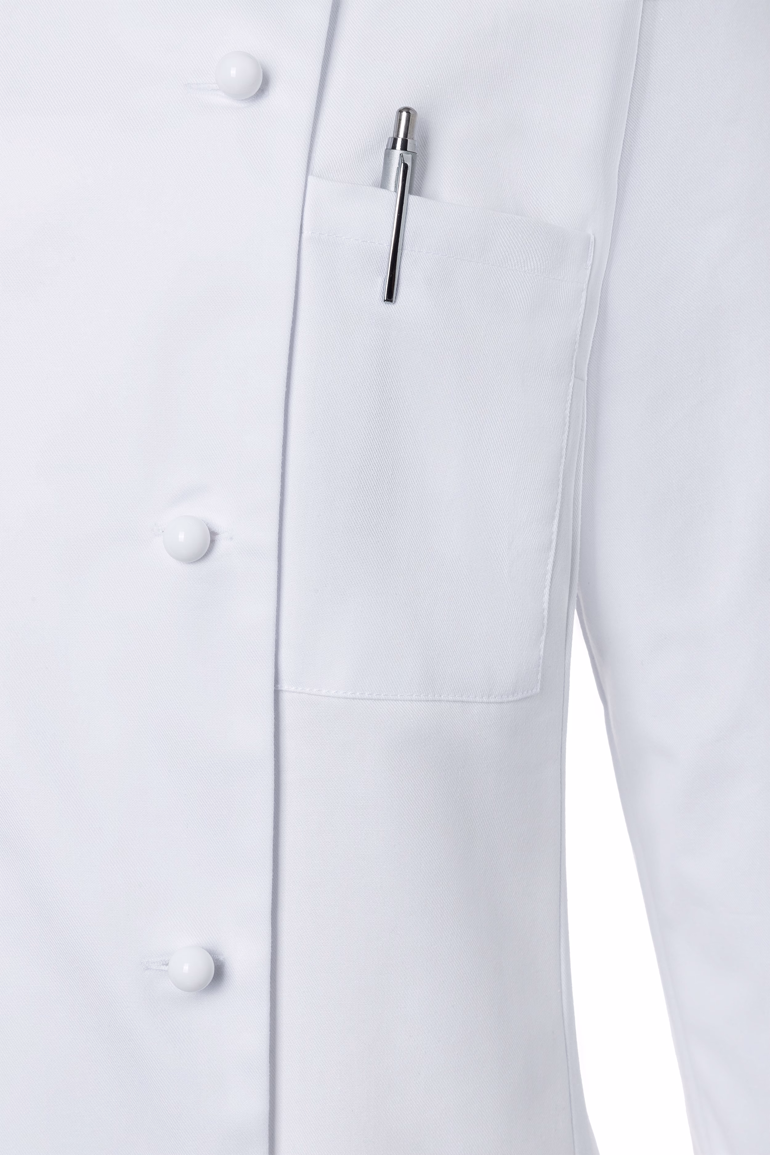 Die zweireihige Jacke verfügt über einen klassischen Stehkragen, der Ihrem Outfit eine elegante Note verleiht. Die moderne Schlitzmanschette an den Ärmeln lässt sich unkompliziert umkrempeln, sodass Sie flexibel auf unterschiedliche Arbeitssituationen reagieren können. Eine linksseitige Brusttasche (9 x 14 cm) bietet ausreichend Platz für kleine Utensilien oder Notizen, die Sie stets griffbereit haben möchten. Der Verschluss erfolgt über Kugelknöpfe – diese sind separat erhältlich, sodass Sie individuelle Akzente setzen können.