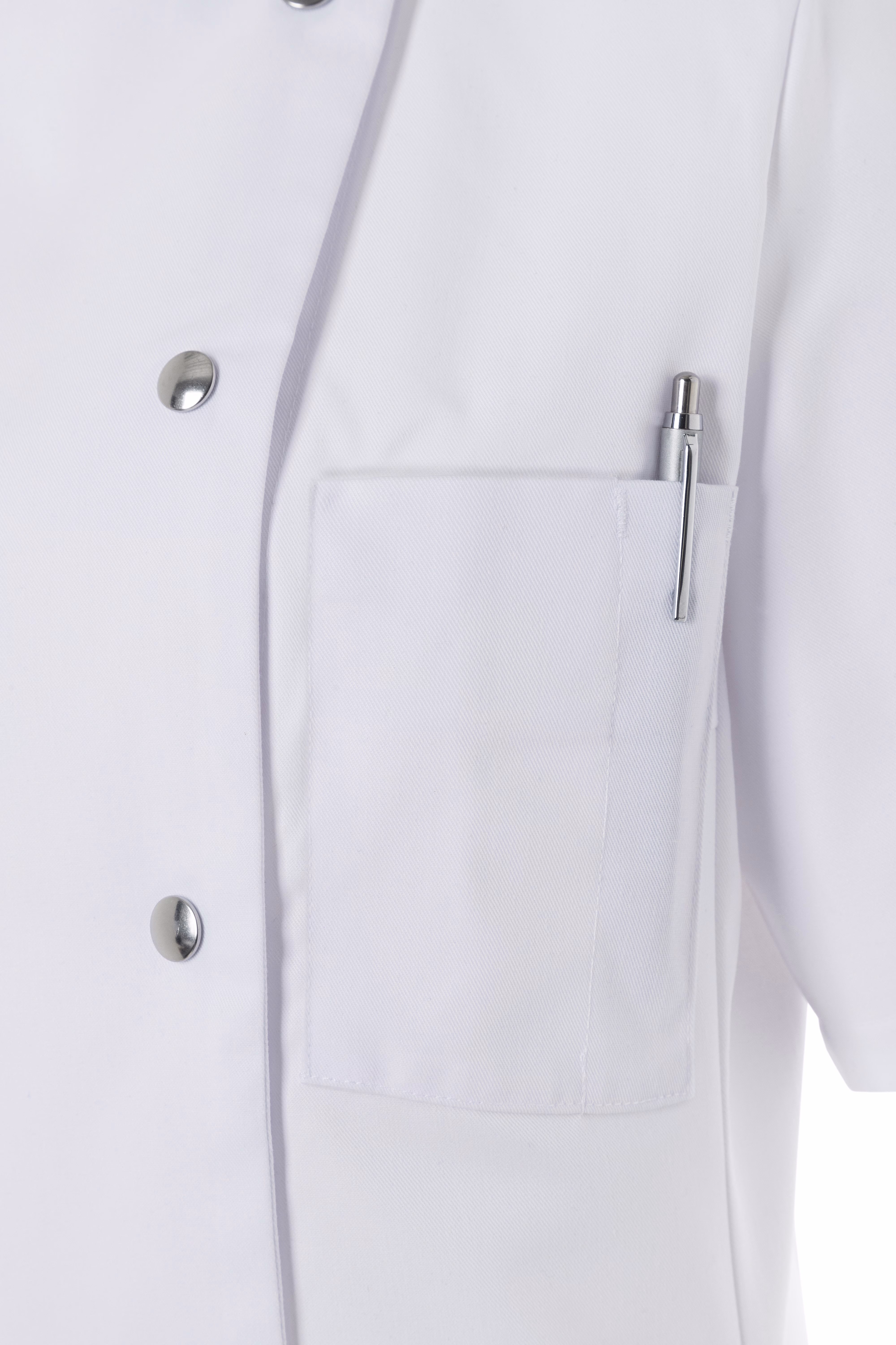 Der Stehkragen verleiht der Kochjacke einen modernen Look und schützt gleichzeitig den Halsbereich. Die einreihige Knopfleiste mit fünf robusten Druckknöpfen ermöglicht ein einfaches An- und Ausziehen sowie schnelle Anpassungen während des Arbeitstages. Brustabnäher sowie Flankennähte vorne und hinten formen eine feminine Silhouette, die sich elegant an Ihren Körper anschmiegt.