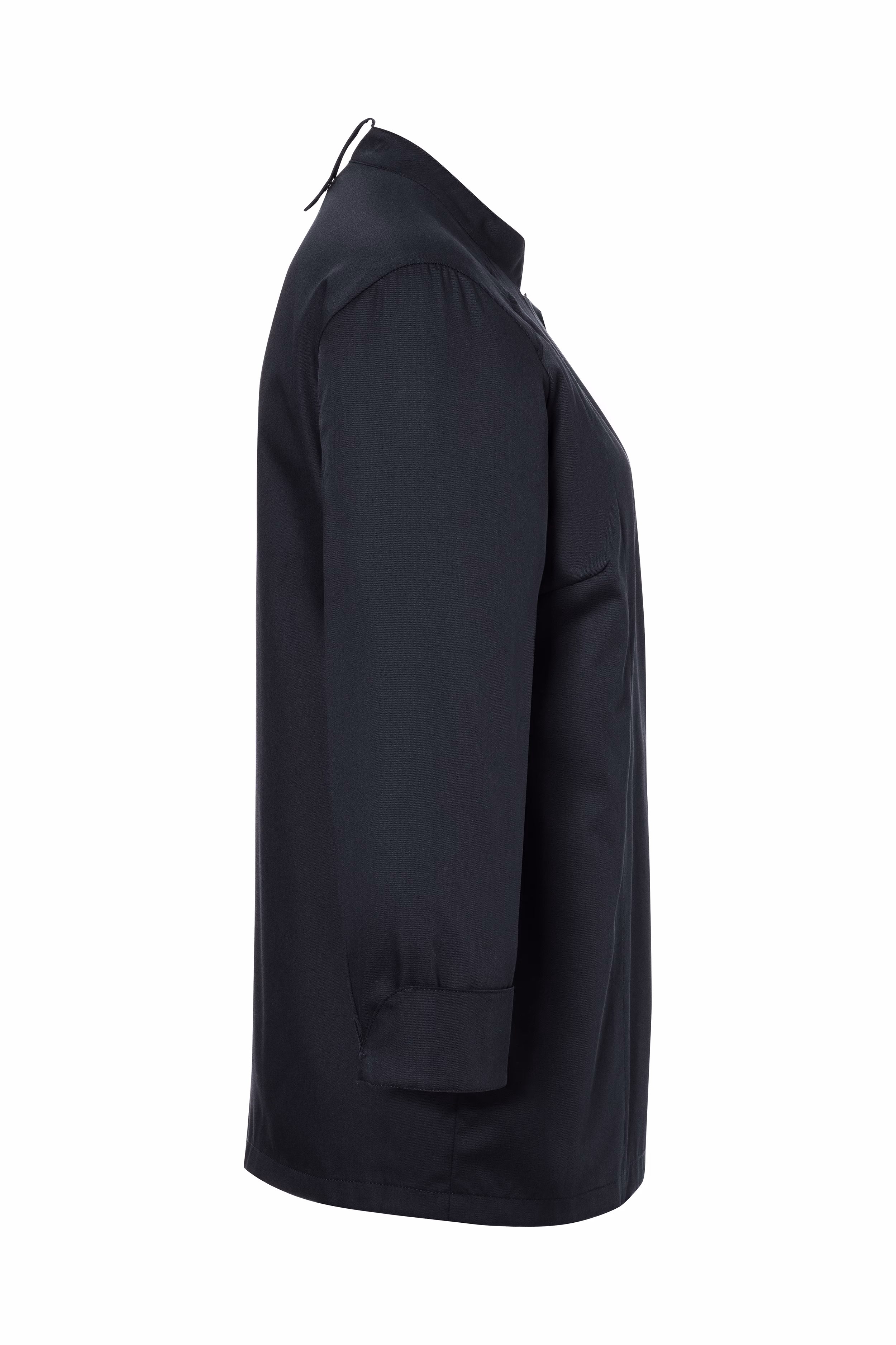 Die verdeckte Knopfleiste mit robusten Druckknöpfen erlaubt ein schnelles Öffnen und Schließen – ideal, wenn es im Service oder in der Küche einmal hektisch wird. Eine aufgesetzte Ärmeltasche auf der linken Seite bietet Platz für kleine Utensilien, ergänzt durch ein separates Stiftfach, das Ordnung garantiert. Besonders praktisch ist die Schlaufe am hinteren Kragen: Sie hält Ihre Latzschürze sicher an Ort und Stelle und verhindert unangenehmes Verrutschen während des Arbeitens.