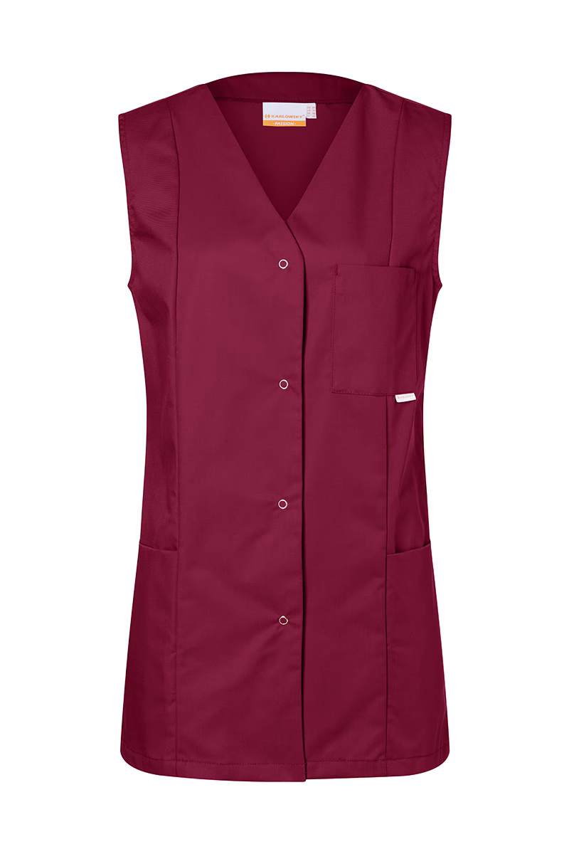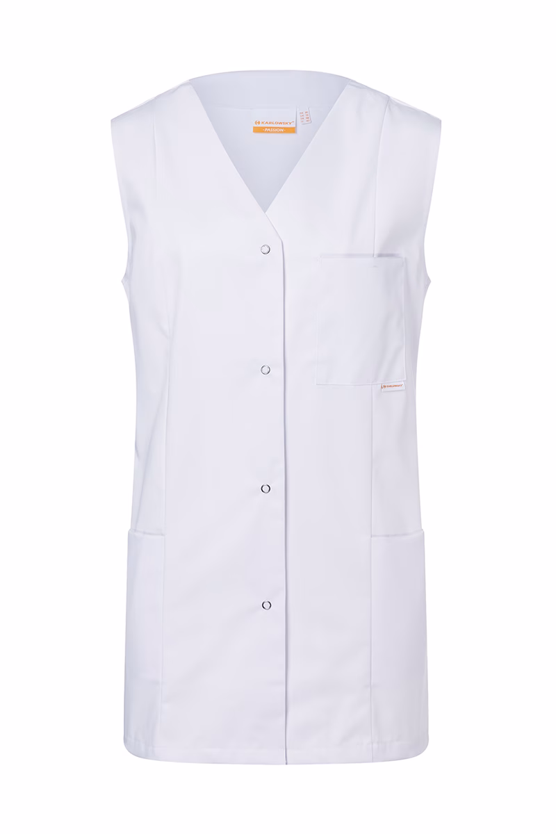 Die lockere Comfort-Passform des ärmellosen Damenkasacks ermöglicht uneingeschränkte Bewegungsfreiheit – ideal für lange Arbeitsschichten in dynamischen Umgebungen. Englische Nähte sorgen nicht nur für eine ansprechende Optik, sondern auch für zusätzliche Stabilität. Der V-Ausschnitt verleiht dem Modell eine moderne Note und unterstützt zugleich ein angenehmes Trageklima. Für praktische Funktionalität sind zwei seitlich versteckte Taschen sowie eine aufgesetzte Brusttasche (11 x 13 cm) integriert, die genügend Stauraum für kleine Utensilien bieten. Die offene Knopfleiste mit vier Druckknöpfen ermöglicht einen schnellen Verschluss sowie unkompliziertes An- und Ausziehen.