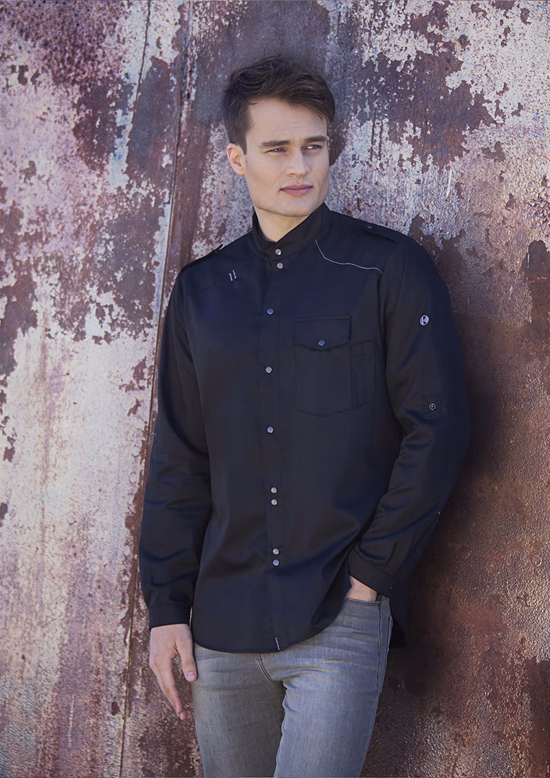 Der modische Stehkragen verleiht dem Hemd eine elegante Note, während der Zierriegel an den Schultern einen unverwechselbaren Look schafft. Druckknöpfe ermöglichen ein schnelles Öffnen und Schließen des Hemds – ideal für hektische Situationen in der Küche.