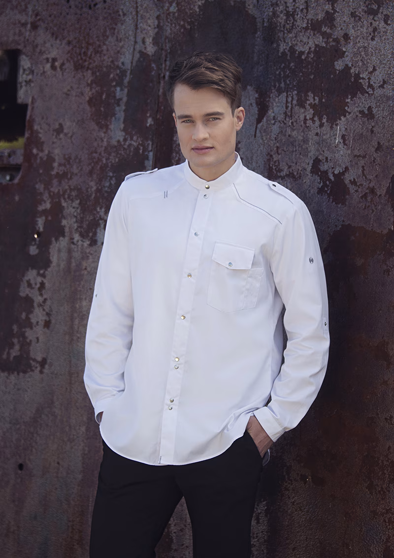 Der modische Stehkragen verleiht dem Hemd eine elegante Note, während der Zierriegel an den Schultern einen unverwechselbaren Look schafft. Druckknöpfe ermöglichen ein schnelles Öffnen und Schließen des Hemds – ideal für hektische Situationen in der Küche.