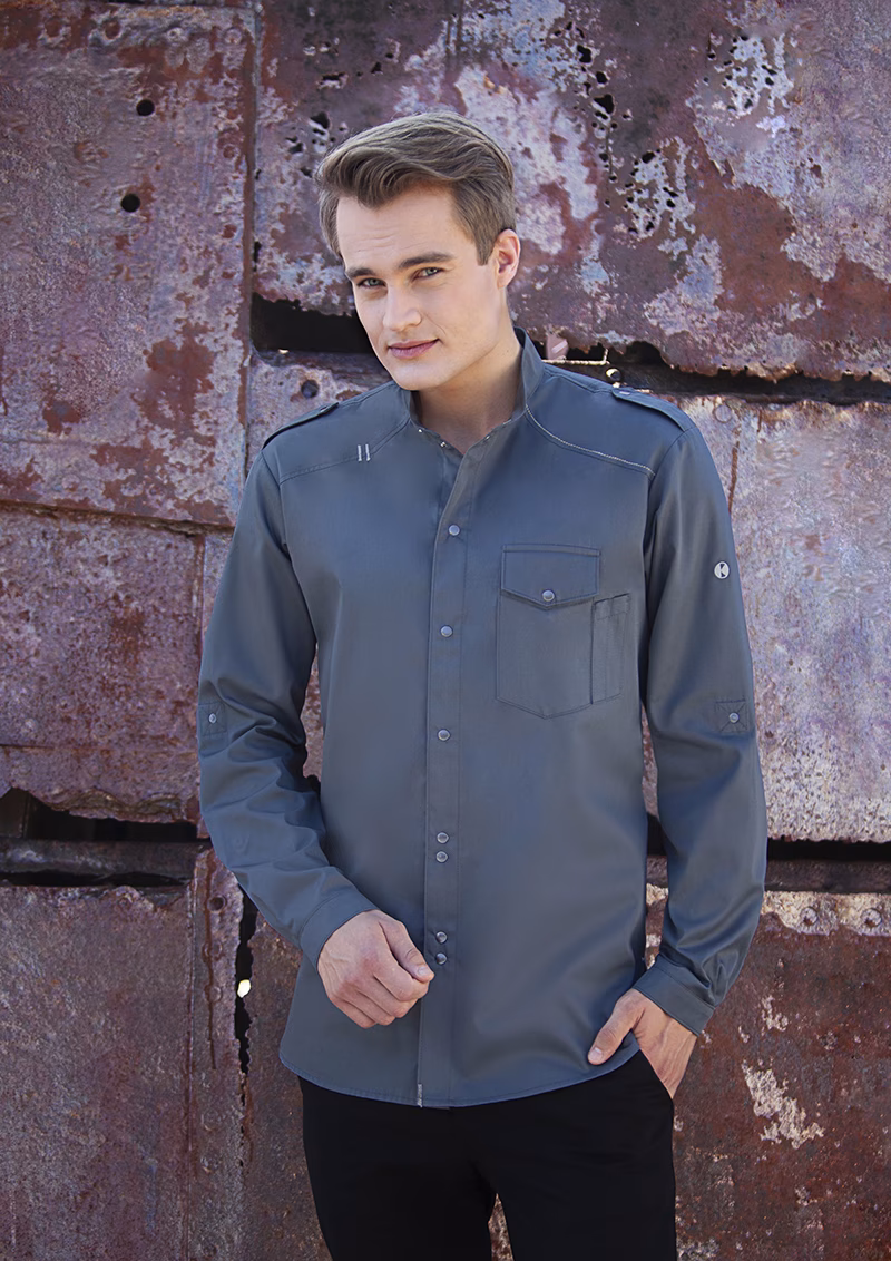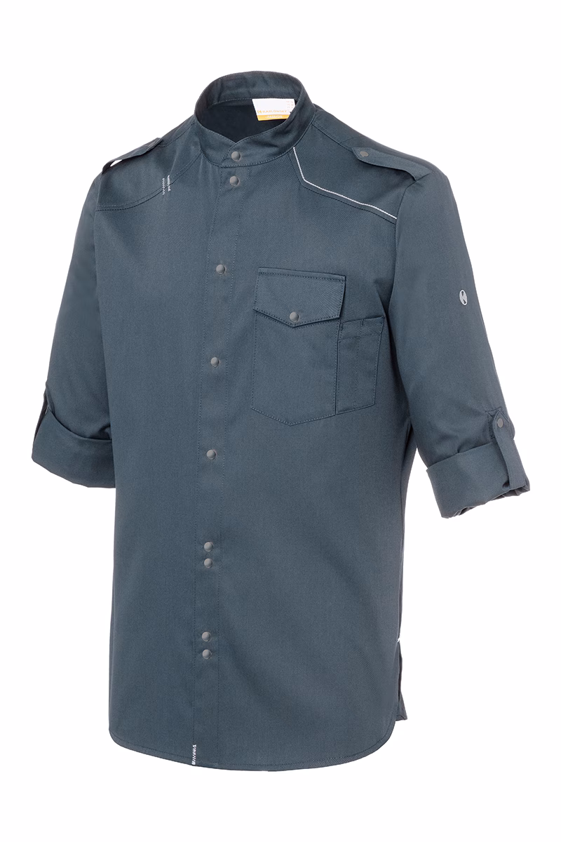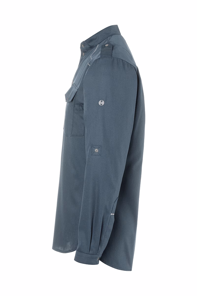 Der modische Stehkragen verleiht dem Hemd eine elegante Note, während der Zierriegel an den Schultern einen unverwechselbaren Look schafft. Druckknöpfe ermöglichen ein schnelles Öffnen und Schließen des Hemds – ideal für hektische Situationen in der Küche.