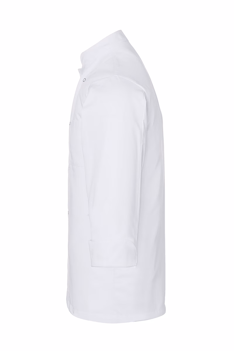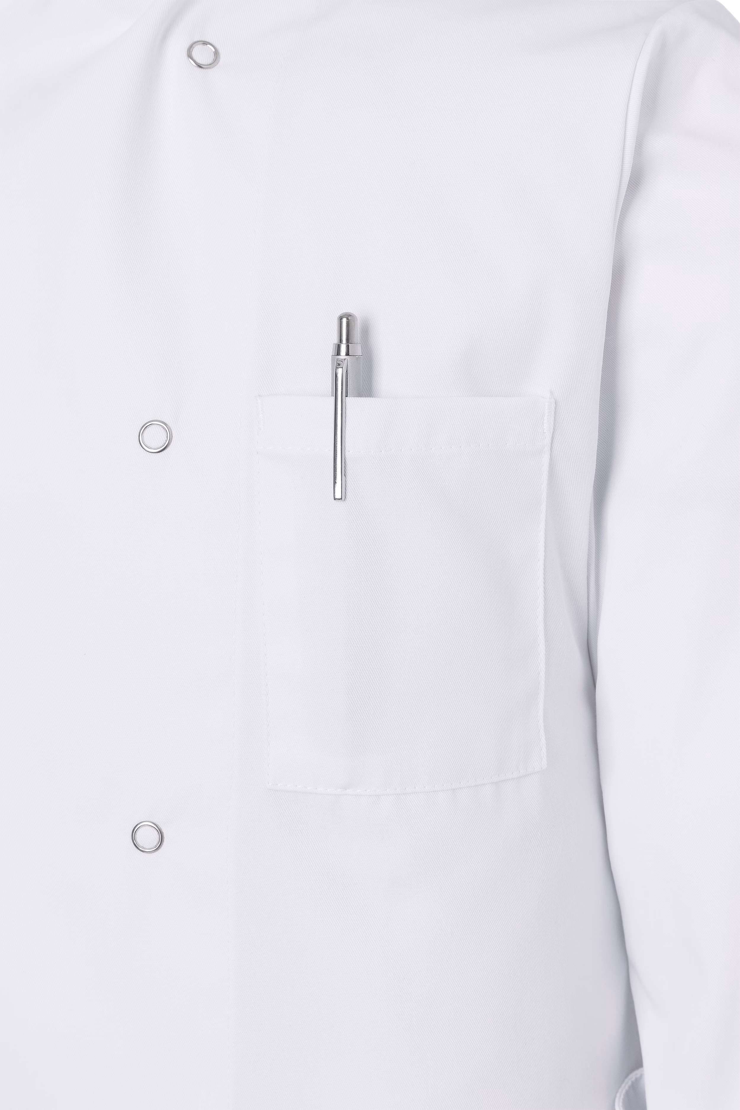 Die klassische Unisex-Kochjacke überzeugt durch ihren bequemen Schnitt, der viel Bewegungsfreiheit bietet – ideal, um auch in hektischen Situationen entspannt zu arbeiten. Die Ärmelmanschetten sind mit einem praktischen Schlitz versehen, sodass Sie sie mühelos hochkrempeln können. So passen Sie die Jacke flexibel an Ihre Bedürfnisse an. Der zweireihige Verschluss mit zehn stabilen Druckknöpfen erlaubt ein schnelles An- und Ausziehen sowie eine sichere Fixierung.