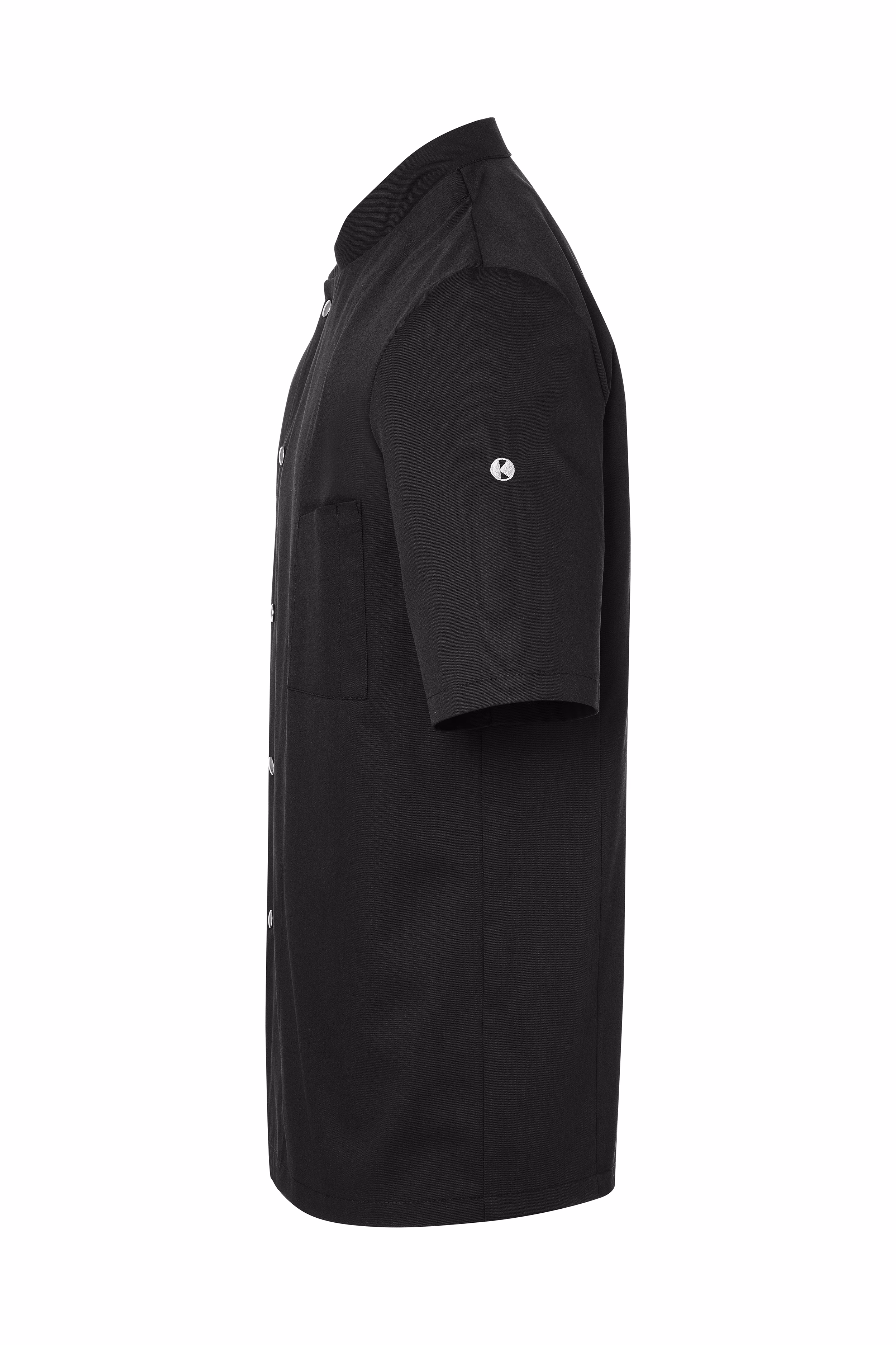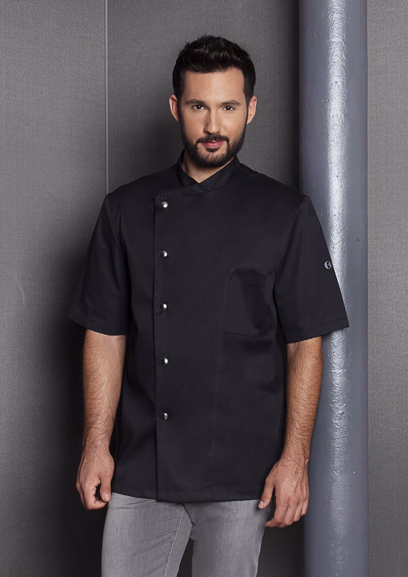 Die Kochjacke zeichnet sich durch ihre reguläre Passform aus, die Bewegungsfreiheit garantiert und dabei stets eine gepflegte Silhouette bewahrt. Kurze Ärmel bieten optimale Belüftung an heißen Arbeitstagen, während der Stehkragen einen klassischen Look mit modernem Flair verbindet. Wiener Nähte am Rückenteil erhöhen nicht nur die Stabilität, sondern formen auch eine elegante Rückenpartie, die für einen souveränen Auftritt sorgt.