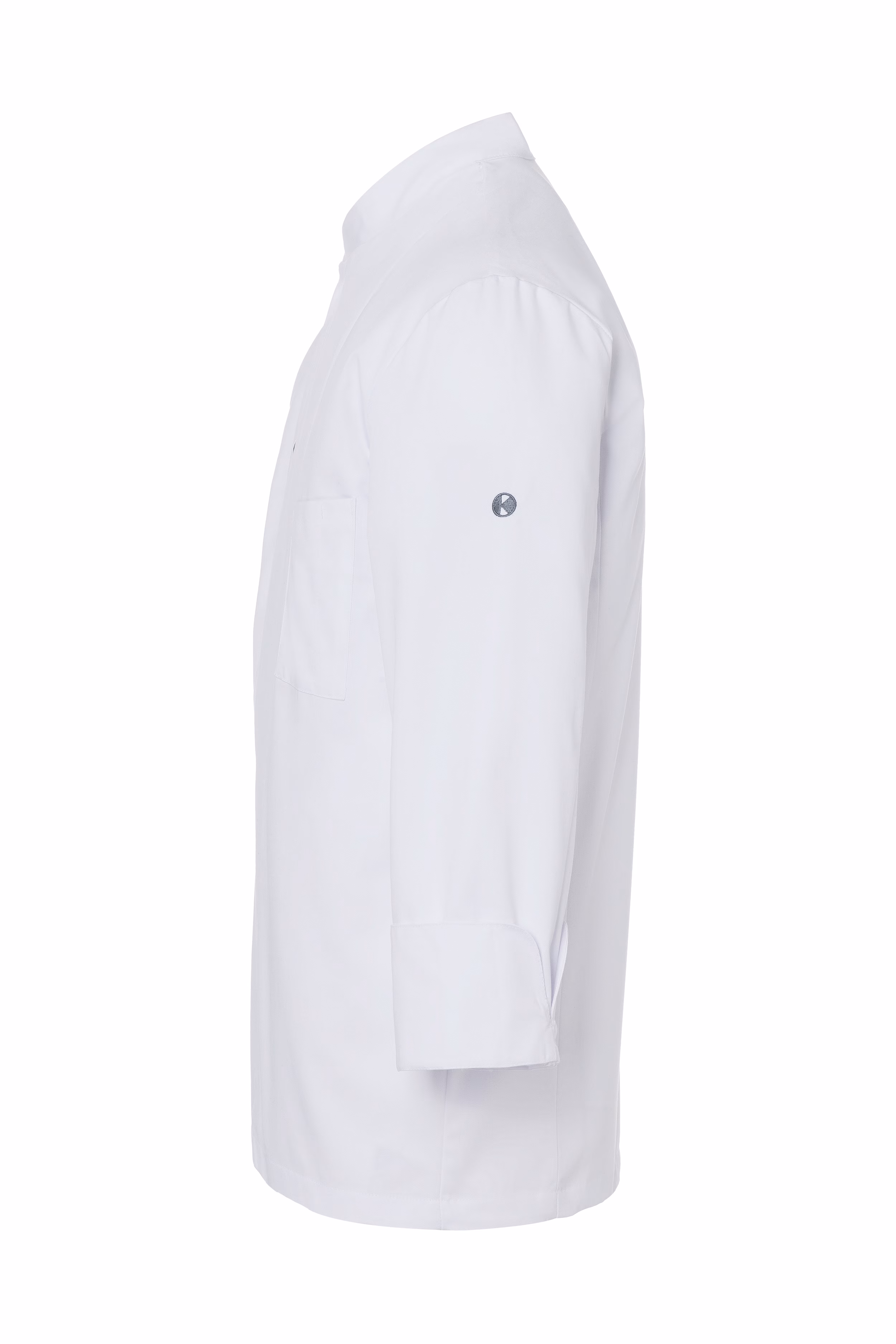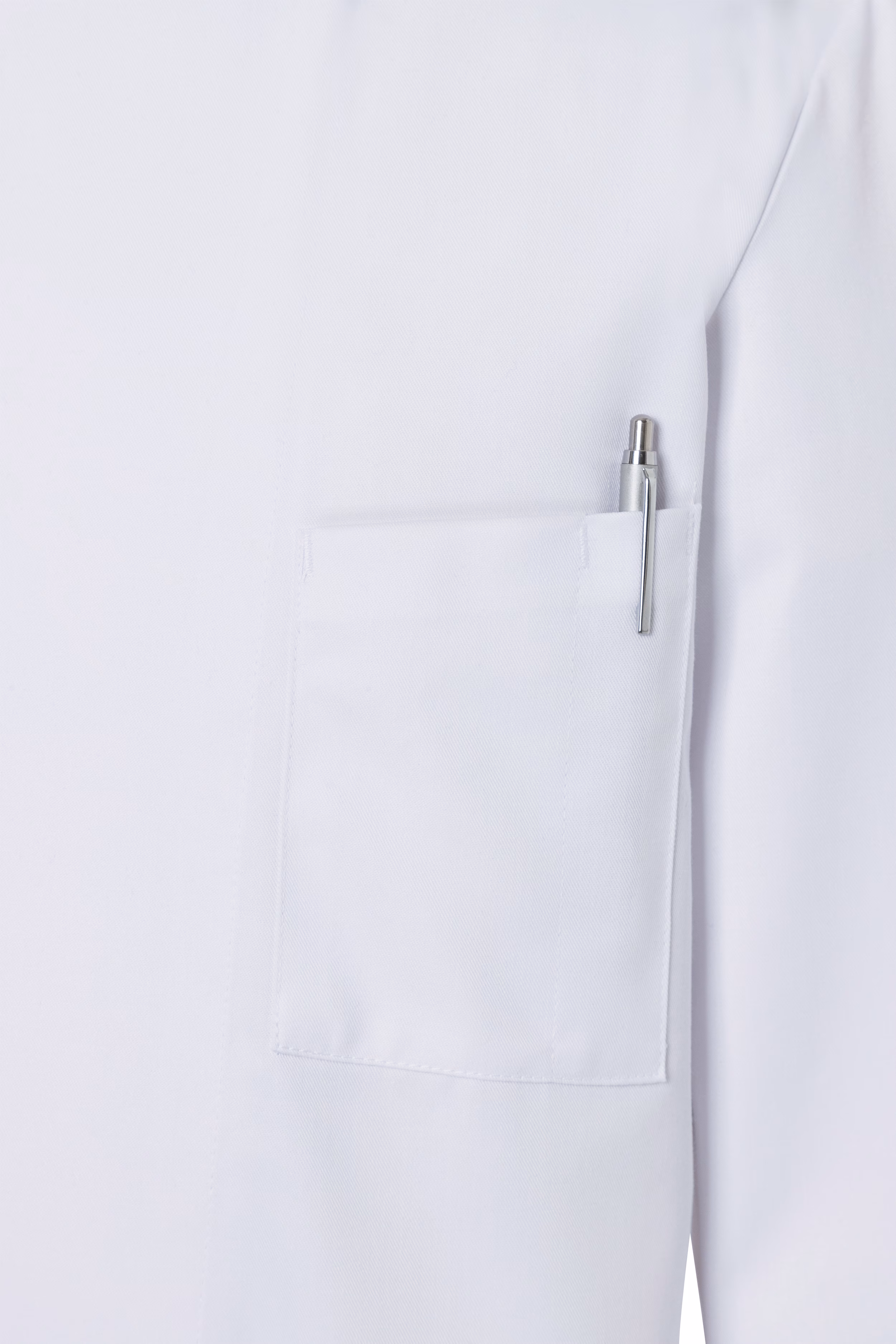 Ihre Utensilien haben Sie dank der aufgesetzten, angeschrägten Brusttasche stets griffbereit. Das integrierte Stiftfach ermöglicht es Ihnen, Schreibgeräte sicher zu verstauen – so behalten Sie jederzeit den Überblick über Notizen oder Bestellungen. Der einreihige Verschluss mit fünf Druckknöpfen erleichtert das schnelle An- und Ausziehen der Jacke und gewährleistet gleichzeitig einen sicheren Sitz während des Arbeitens.