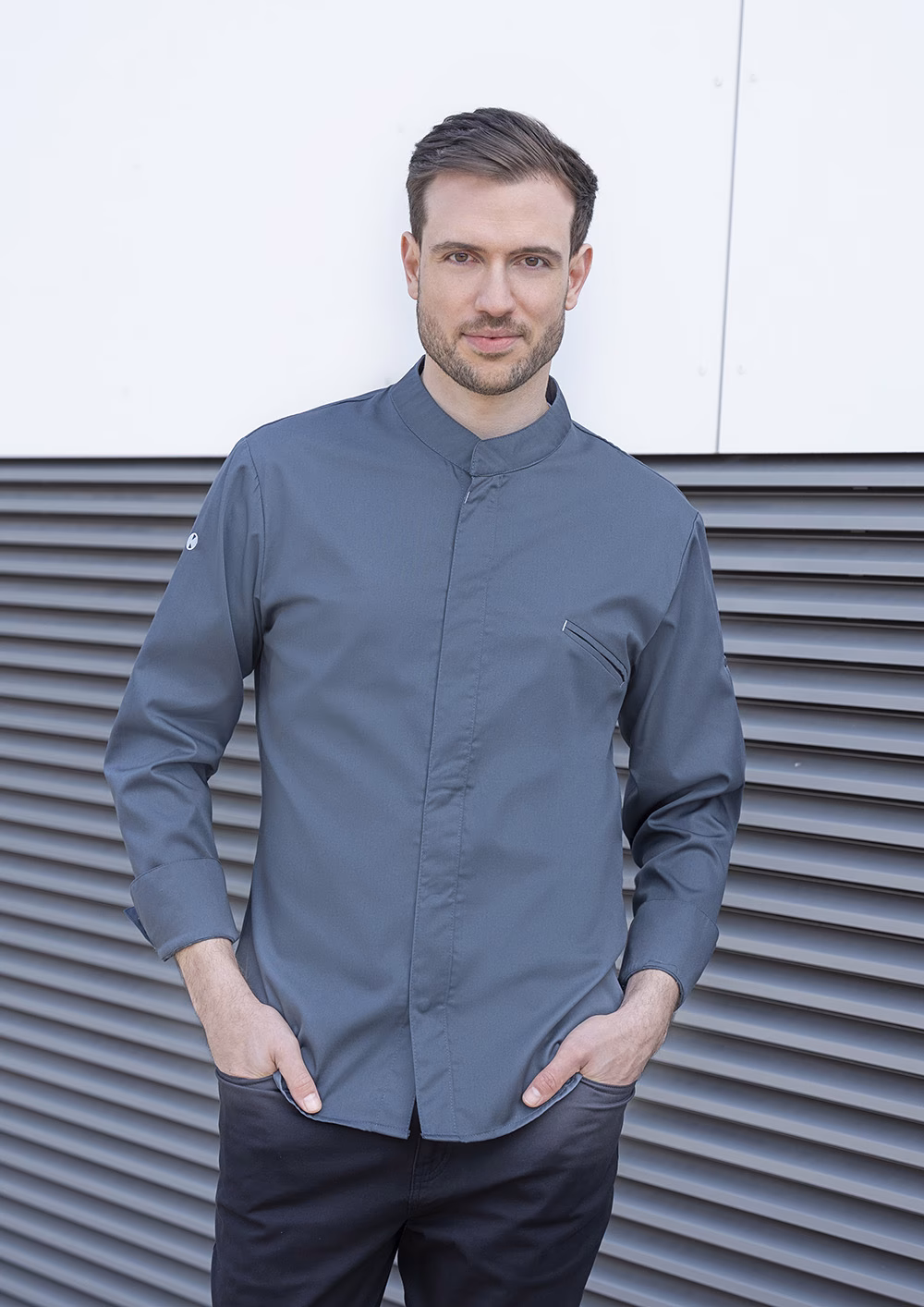 Der moderne Stehkragen verleiht der Jacke eine elegante Optik und schützt zugleich den Nackenbereich. Die verdeckte Knopfleiste mit praktischen Druckknöpfen erlaubt schnelles An- und Ausziehen ohne Zeitverlust. Ärmelmanschetten mit Schlitz bieten zusätzlichen Komfort und erleichtern das individuelle Anpassen der Ärmelweite. Die körpernahe, leicht taillierte Passform unterstützt Ihre Bewegungsfreiheit optimal, ohne einzuengen.