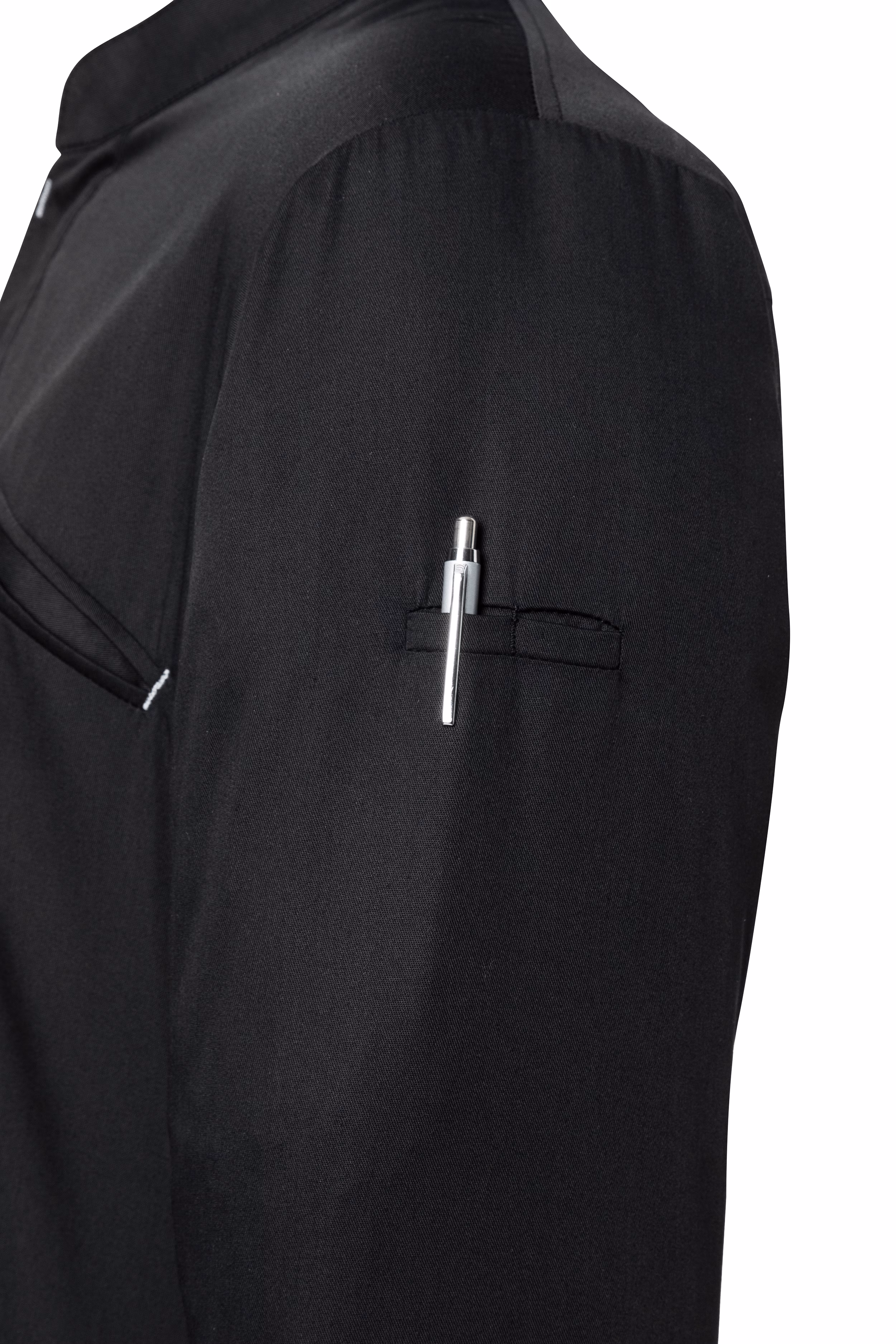 Für wichtige Utensilien steht Ihnen eine stilvolle Brusttasche zur Verfügung, die diskret in das Design integriert ist. Ergänzt wird diese durch eine schmale Leistentasche am linken Ärmel (6 x 1 cm), ideal zum Verstauen kleiner Werkzeuge oder Stifte – so haben Sie alles Wesentliche stets griffbereit.
