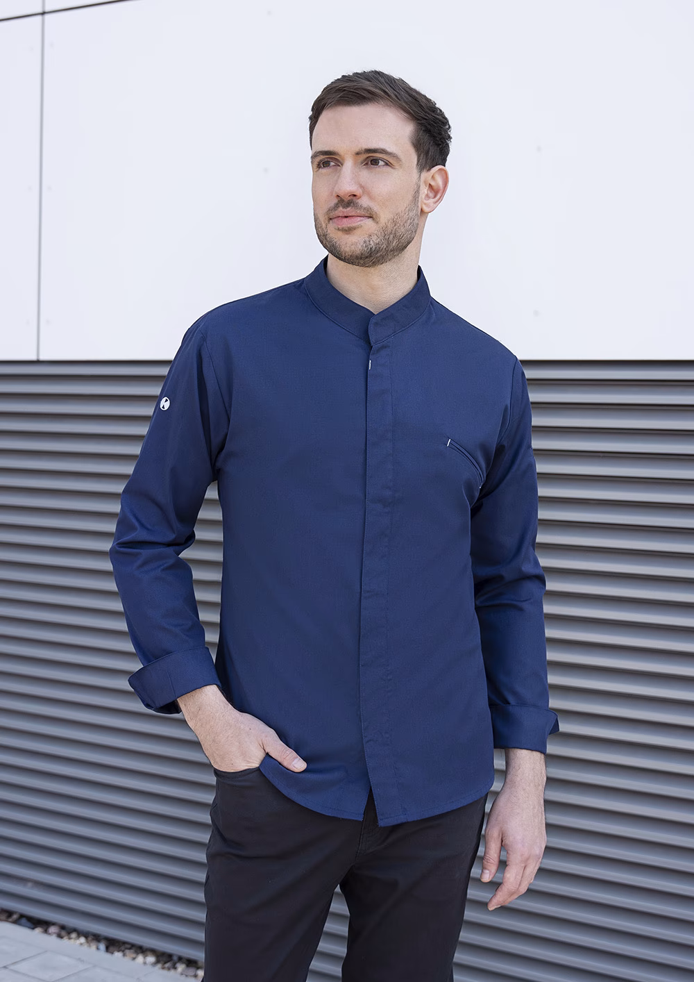 Der moderne Stehkragen verleiht der Jacke eine elegante Optik und schützt zugleich den Nackenbereich. Die verdeckte Knopfleiste mit praktischen Druckknöpfen erlaubt schnelles An- und Ausziehen ohne Zeitverlust. Ärmelmanschetten mit Schlitz bieten zusätzlichen Komfort und erleichtern das individuelle Anpassen der Ärmelweite. Die körpernahe, leicht taillierte Passform unterstützt Ihre Bewegungsfreiheit optimal, ohne einzuengen.