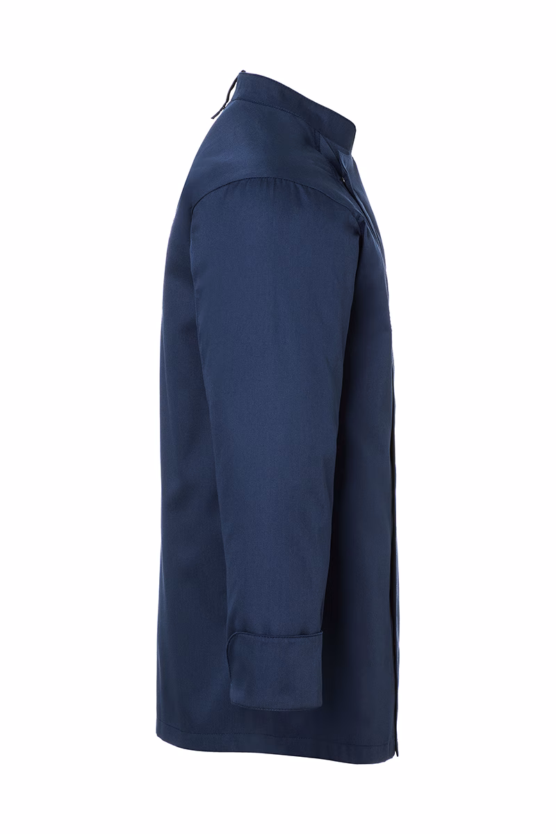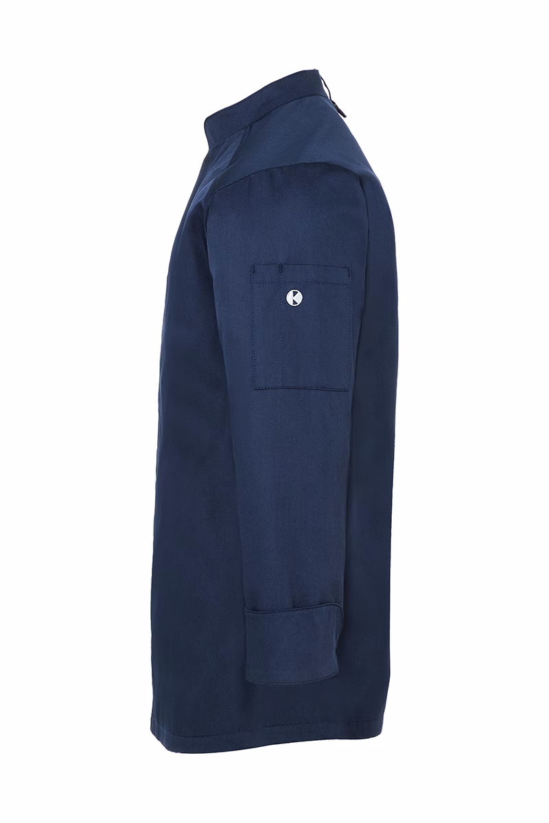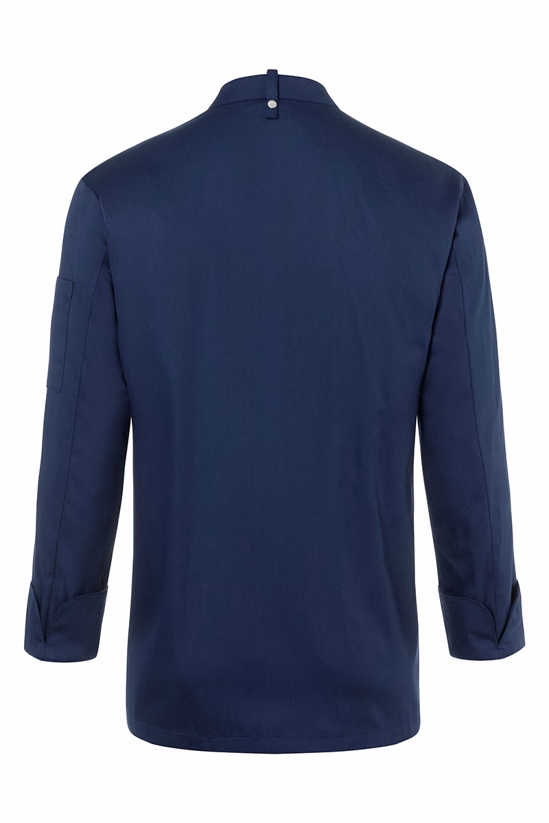 Die Kochjacke verfügt über einen klassischen Stehkragen, der nicht nur elegant wirkt, sondern auch angenehm am Hals anliegt. Druckknöpfe ermöglichen ein schnelles Öffnen und Schließen der verdeckten Knopfleiste – so sind Sie flexibel und können sich ganz auf Ihre Arbeit konzentrieren. Die Ärmelmanschetten mit Schlitz bieten zusätzlichen Komfort bei Bewegungen. Eine praktische Schlaufe am hinteren Kragen fixiert Ihre Latzschürze zuverlässig und verhindert lästiges Verrutschen während des Arbeitens.