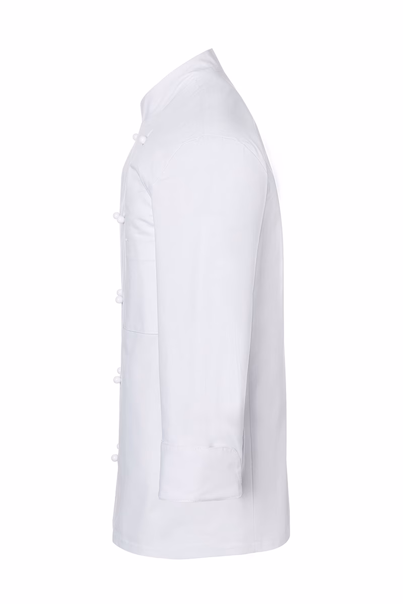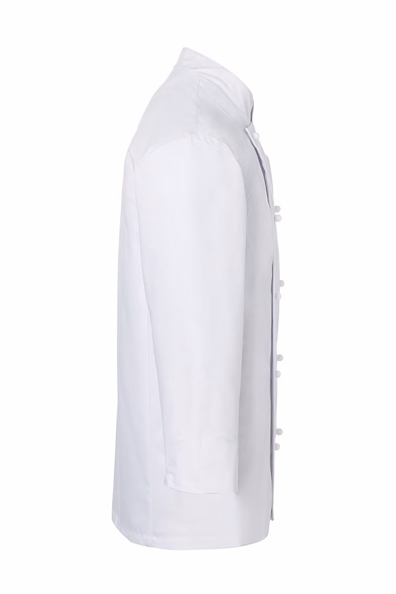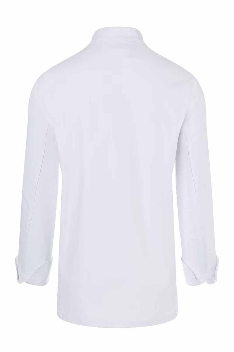 Der gerade geschnittene Regular-Fit sorgt für eine komfortable Passform ohne Einengung, während das nahtlose Vorderteil ohne Seitennähte und die Flankennähte am Rückenteil optimale Bewegungsfreiheit ermöglichen. Der Stehkragen verleiht der Jacke eine professionelle Optik und schützt den Halsbereich zuverlässig. Die Ärmel sind mit modernen Schlitzmanschetten ausgestattet, die sich praktisch umkrempeln lassen – ideal für flexible Temperaturregelung und hygienisches Arbeiten.
