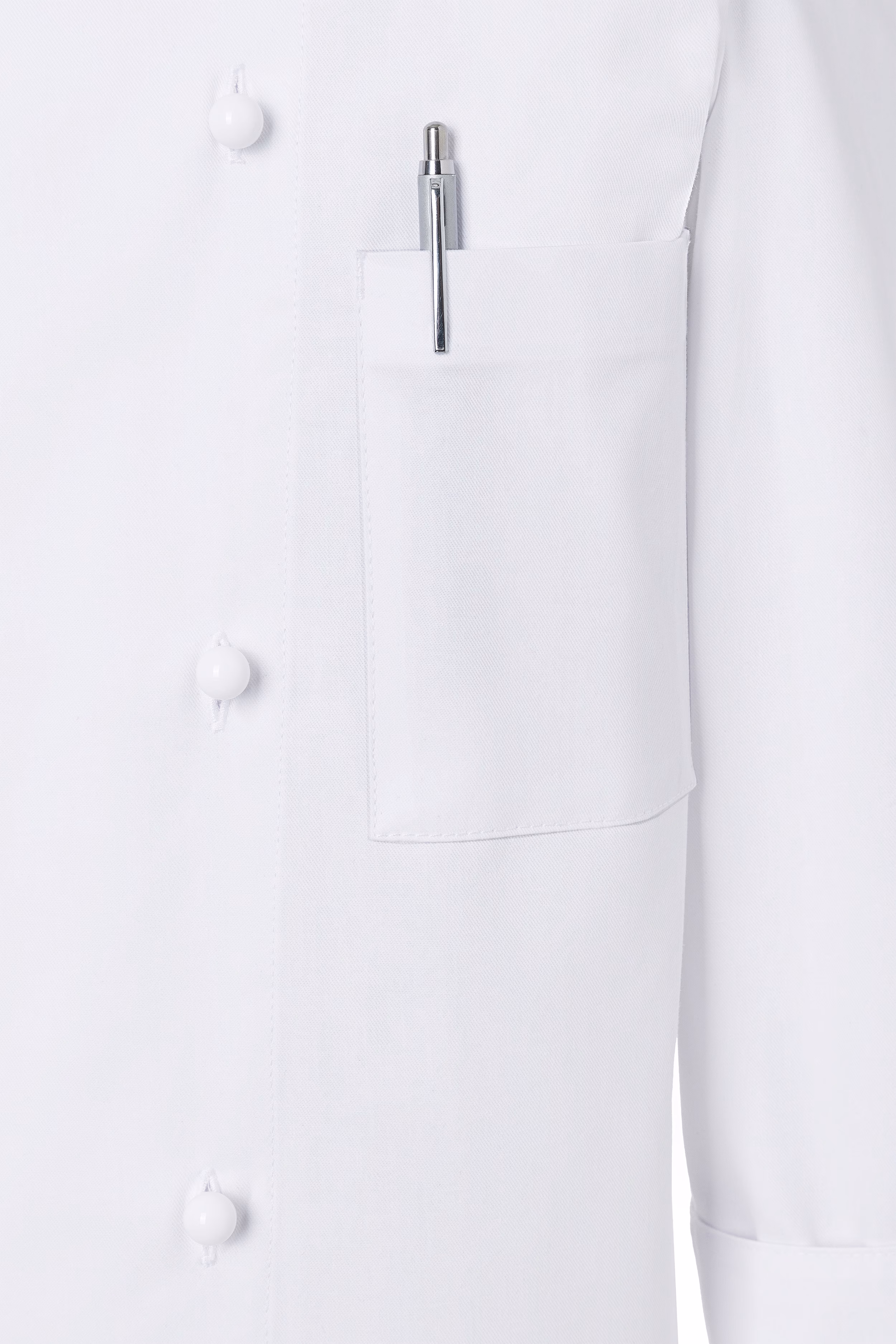 Für Ihre wichtigsten Utensilien steht Ihnen eine großzügige linksseitige Brusttasche zur Verfügung (mindestens 10 x 14 cm), die schnellen Zugriff auf Notizen oder kleine Werkzeuge ermöglicht. Die zweireihige Knopfleiste ist offen gestaltet, sodass Sie individuelle Kugelknöpfe separat auswählen können – so passen Sie das Erscheinungsbild exakt an Ihre Anforderungen an. Die robuste Nahtführung garantiert Langlebigkeit auch bei intensivem Gebrauch.