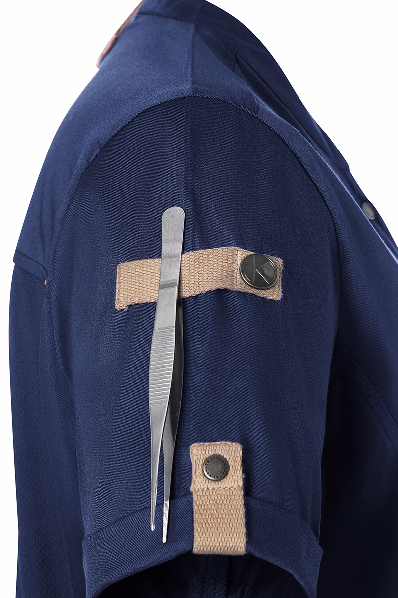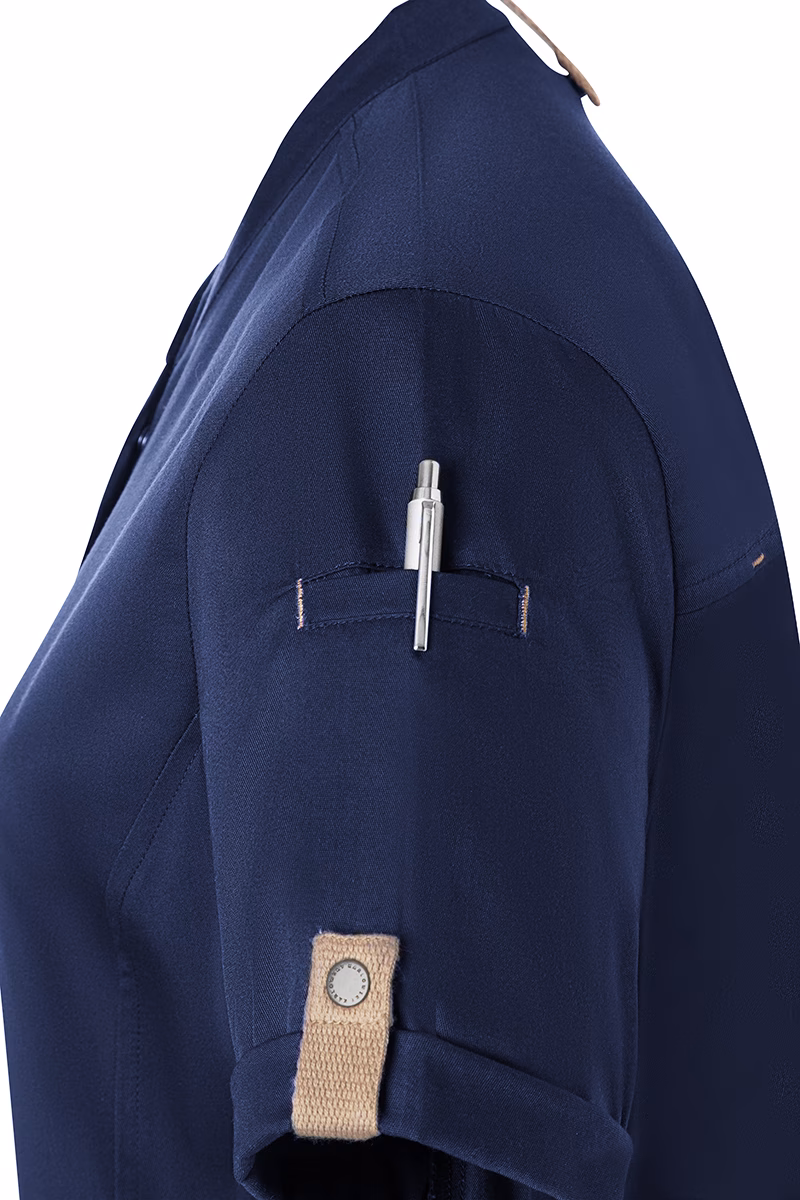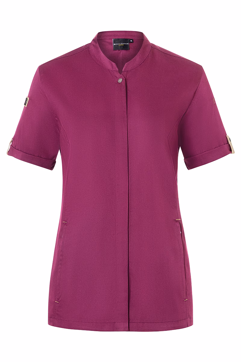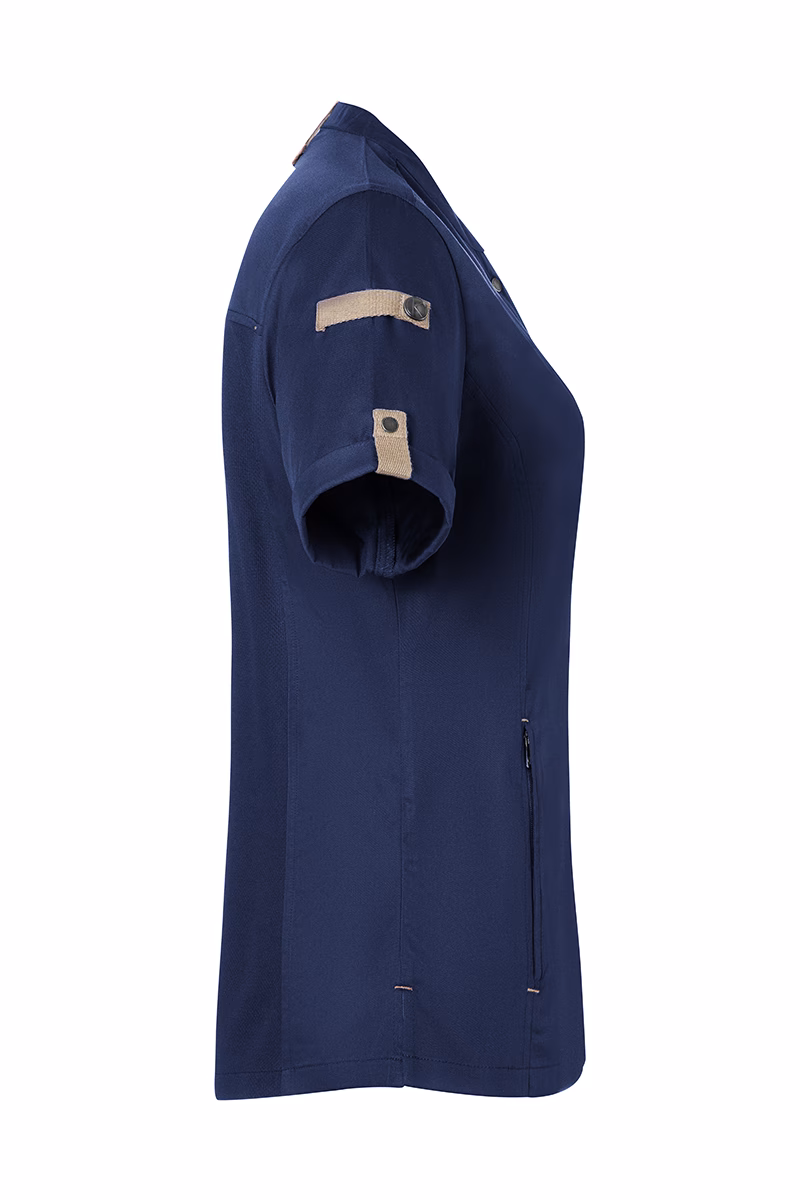 Der moderne, leicht taillierte Schnitt betont die feminine Silhouette ohne einzuengen. Ein Stehkragen verleiht der Jacke eine elegante Optik und schützt zugleich vor Zugluft. Die Druckknöpfe ermöglichen ein schnelles Öffnen und Schließen – praktisch im hektischen Servicebetrieb. Für Ihre Utensilien stehen zwei Reißverschlusstaschen an der Vorderseite sowie eine schmale Leistentasche am linken Ärmel bereit, die sicheren Stauraum bieten, ohne die Beweglichkeit einzuschränken. Stilvolle Kontrastbänder an Ärmeln und Nacken unterstreichen das urbane Design mit natürlichem Flair.