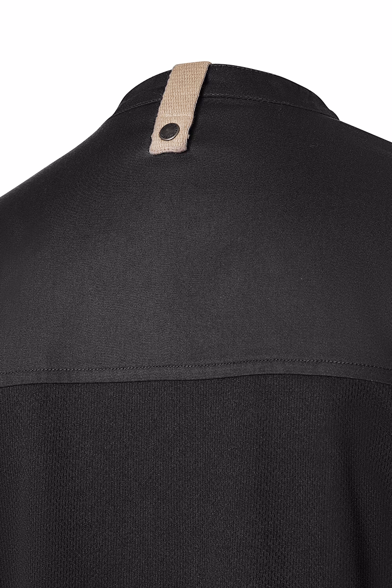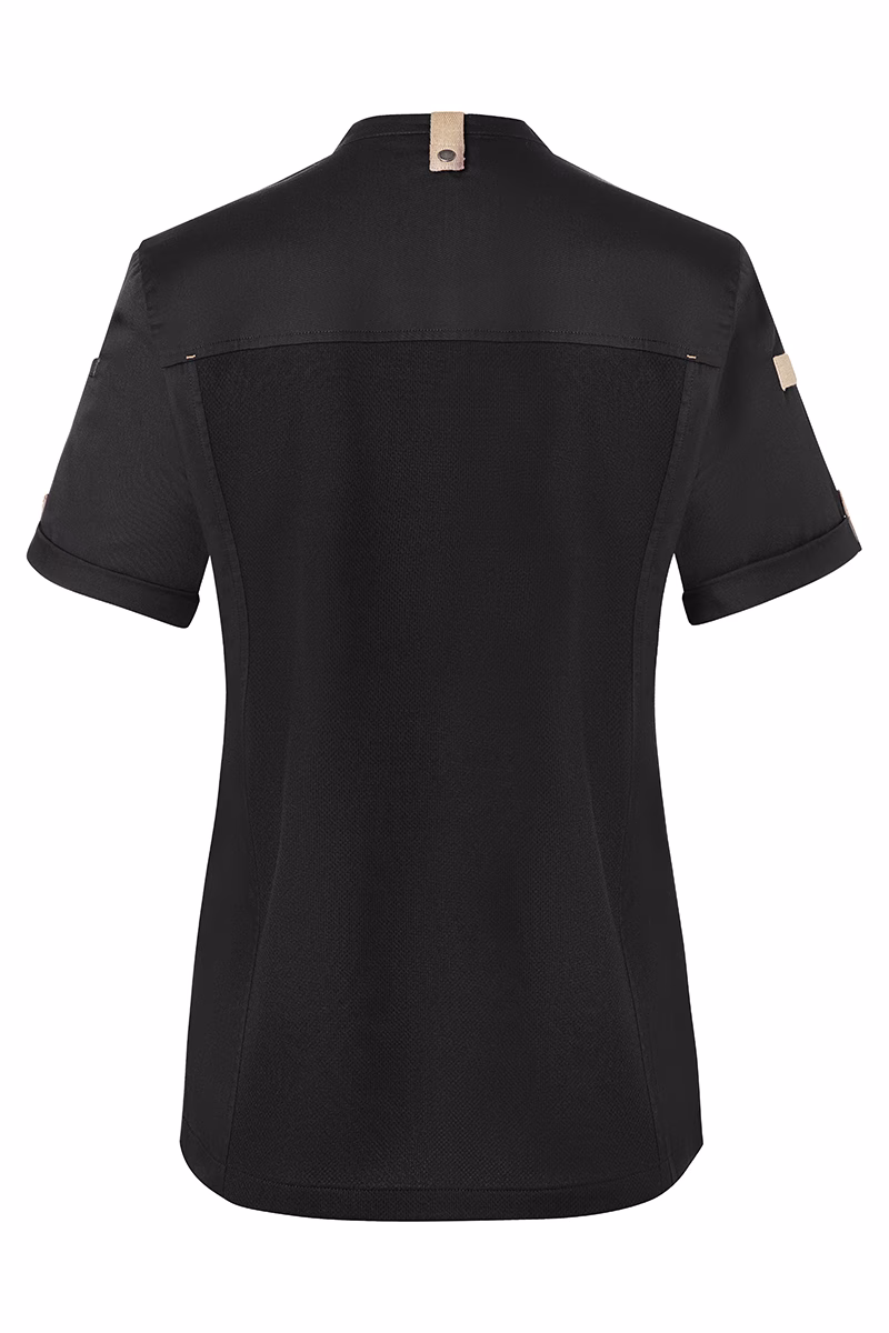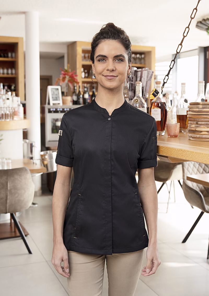 Der moderne, leicht taillierte Schnitt betont die feminine Silhouette ohne einzuengen. Ein Stehkragen verleiht der Jacke eine elegante Optik und schützt zugleich vor Zugluft. Die Druckknöpfe ermöglichen ein schnelles Öffnen und Schließen – praktisch im hektischen Servicebetrieb. Für Ihre Utensilien stehen zwei Reißverschlusstaschen an der Vorderseite sowie eine schmale Leistentasche am linken Ärmel bereit, die sicheren Stauraum bieten, ohne die Beweglichkeit einzuschränken. Stilvolle Kontrastbänder an Ärmeln und Nacken unterstreichen das urbane Design mit natürlichem Flair.