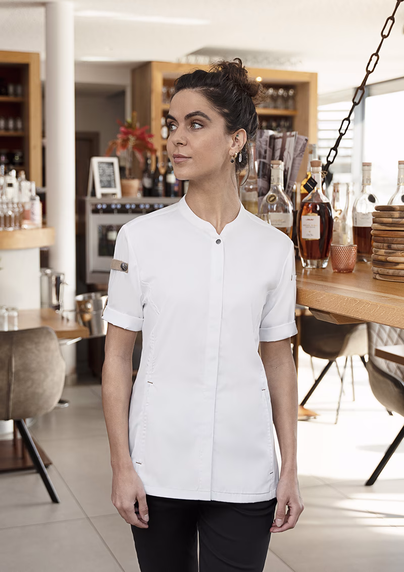 Der moderne, leicht taillierte Schnitt betont die feminine Silhouette ohne einzuengen. Ein Stehkragen verleiht der Jacke eine elegante Optik und schützt zugleich vor Zugluft. Die Druckknöpfe ermöglichen ein schnelles Öffnen und Schließen – praktisch im hektischen Servicebetrieb. Für Ihre Utensilien stehen zwei Reißverschlusstaschen an der Vorderseite sowie eine schmale Leistentasche am linken Ärmel bereit, die sicheren Stauraum bieten, ohne die Beweglichkeit einzuschränken. Stilvolle Kontrastbänder an Ärmeln und Nacken unterstreichen das urbane Design mit natürlichem Flair.