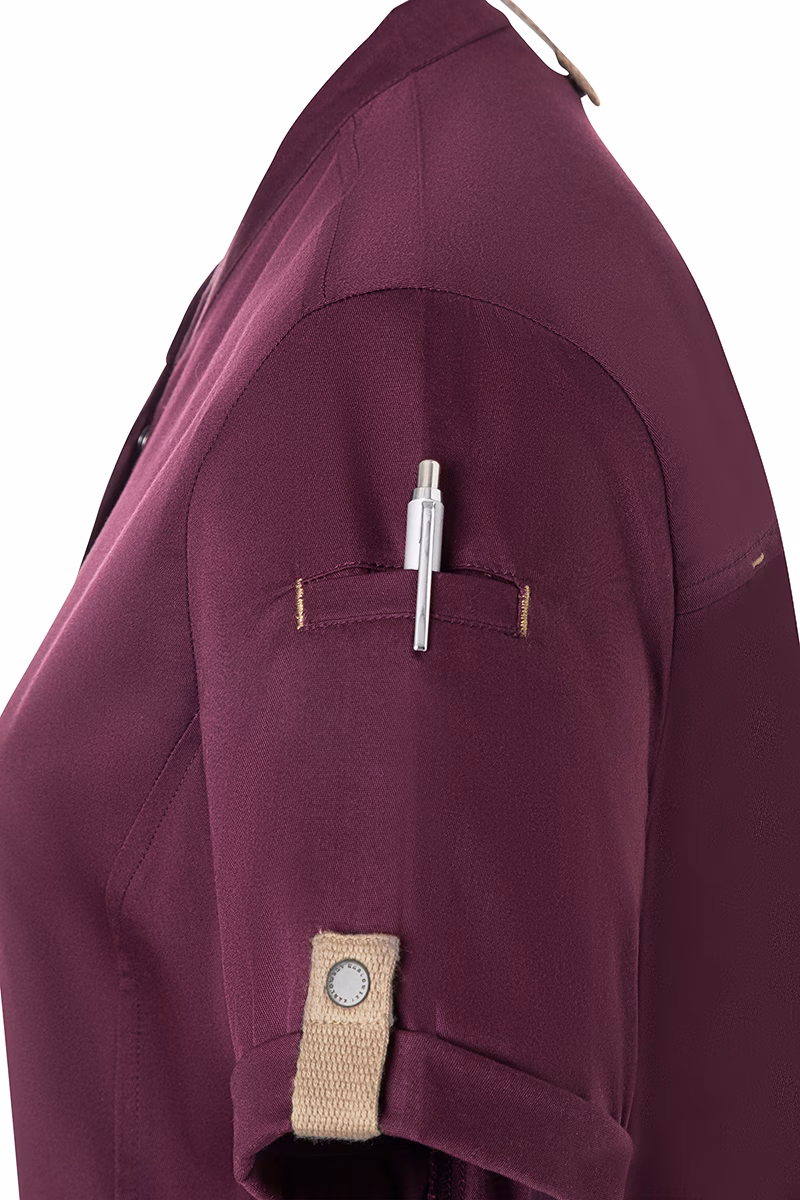 Der moderne, leicht taillierte Schnitt betont die feminine Silhouette ohne einzuengen. Ein Stehkragen verleiht der Jacke eine elegante Optik und schützt zugleich vor Zugluft. Die Druckknöpfe ermöglichen ein schnelles Öffnen und Schließen – praktisch im hektischen Servicebetrieb. Für Ihre Utensilien stehen zwei Reißverschlusstaschen an der Vorderseite sowie eine schmale Leistentasche am linken Ärmel bereit, die sicheren Stauraum bieten, ohne die Beweglichkeit einzuschränken. Stilvolle Kontrastbänder an Ärmeln und Nacken unterstreichen das urbane Design mit natürlichem Flair.