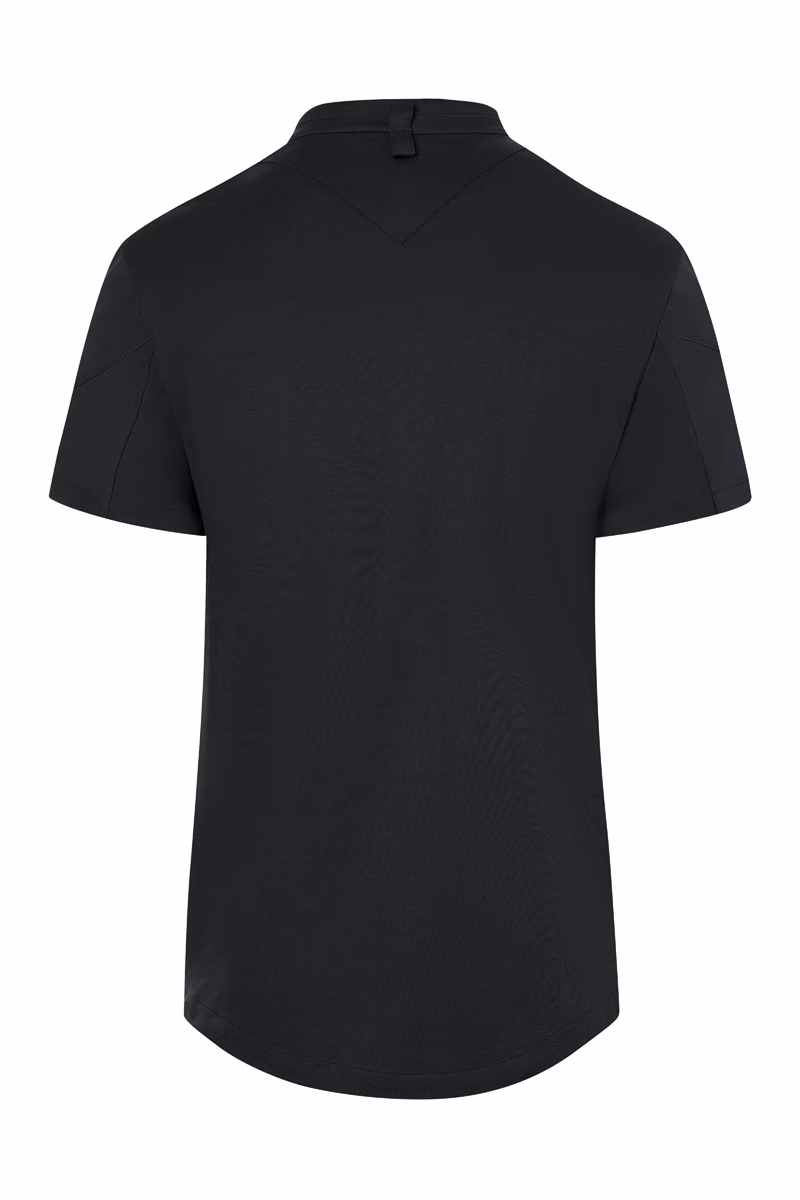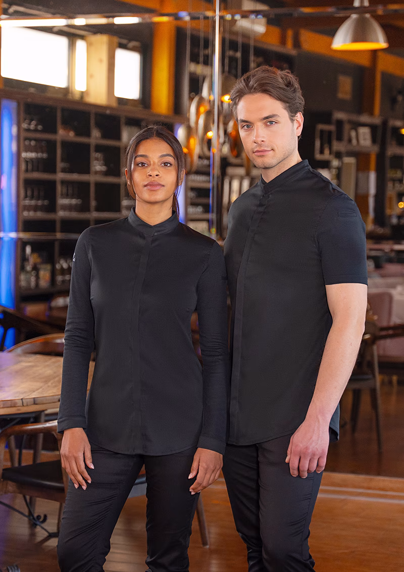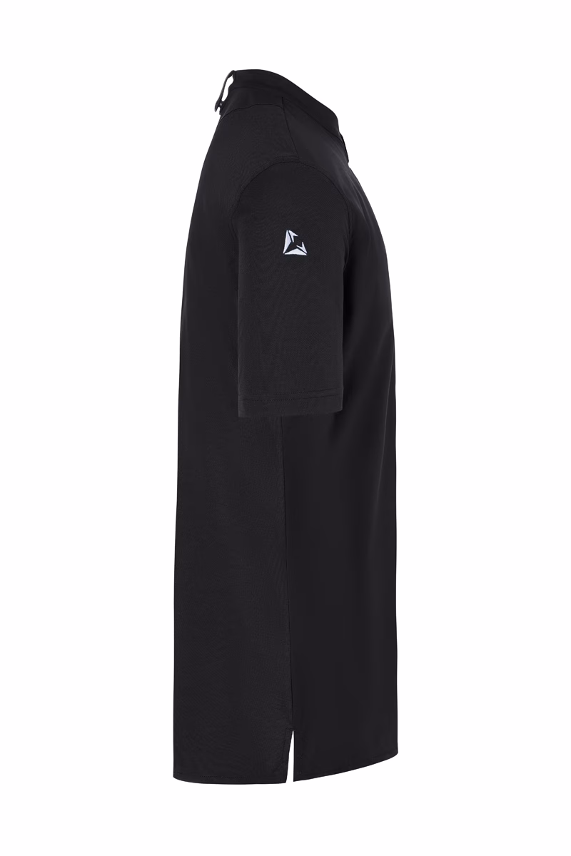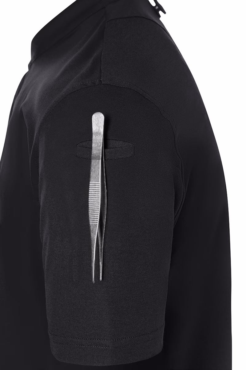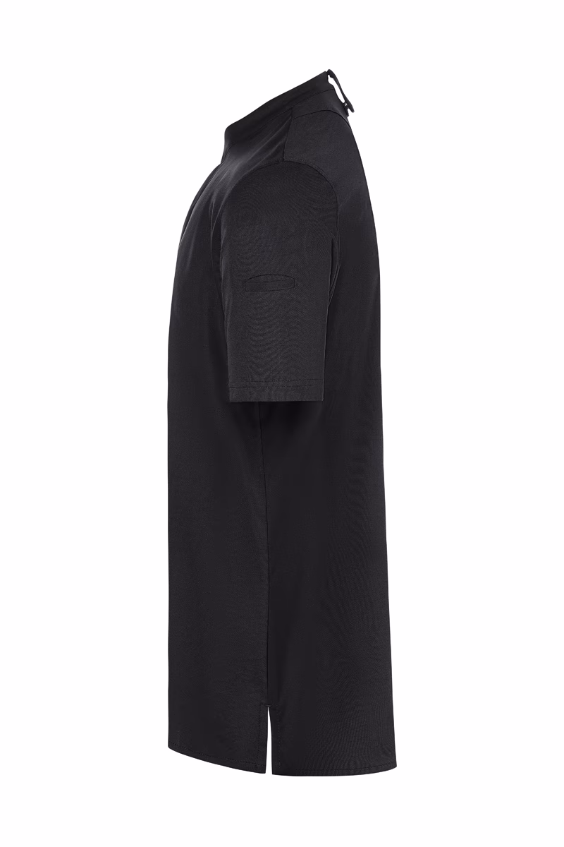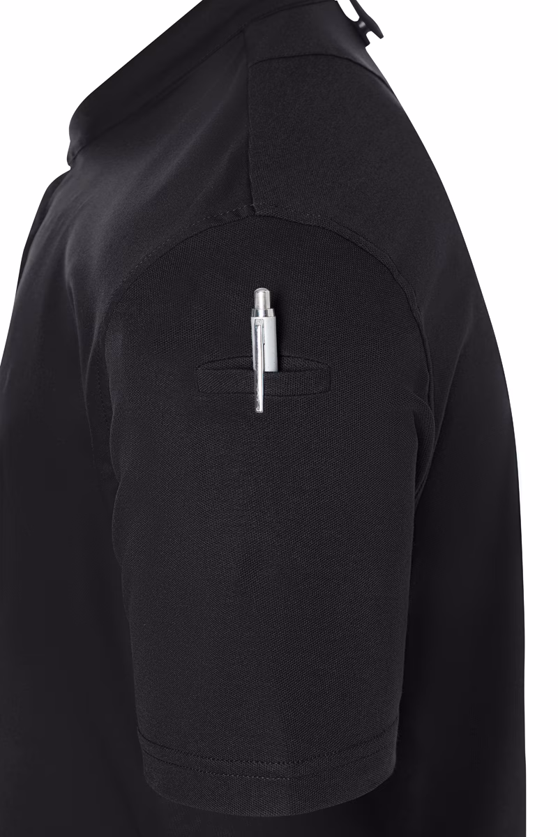 Das Vorderteil besteht aus einem hochwertigen Köpergewebe mit 48 % Polyester, 48 % Lyocell (TENCEL™) und 4 % Elastolefin. Diese Kombination sorgt für eine angenehme Elastizität und eine schlanke Passform, die sich flexibel an Ihre Bewegungen anpasst. Die Rückseite sowie die Ärmel sind aus atmungsaktivem Jersey-Piqué gefertigt, das aus 55 % Baumwolle und 45 % recyceltem Polyester besteht. Dieses nachhaltige Gewebe unterstützt die Feuchtigkeitsregulierung und fördert ein trockenes Hautgefühl – ideal für lange Arbeitstage in warmen Küchenumgebungen.