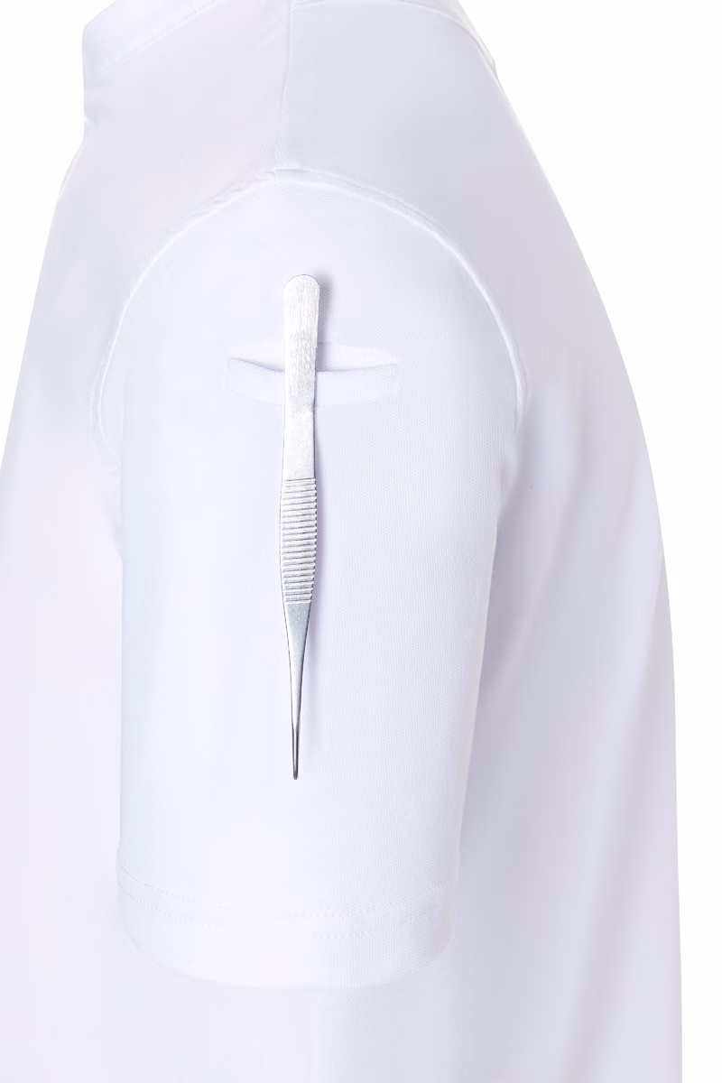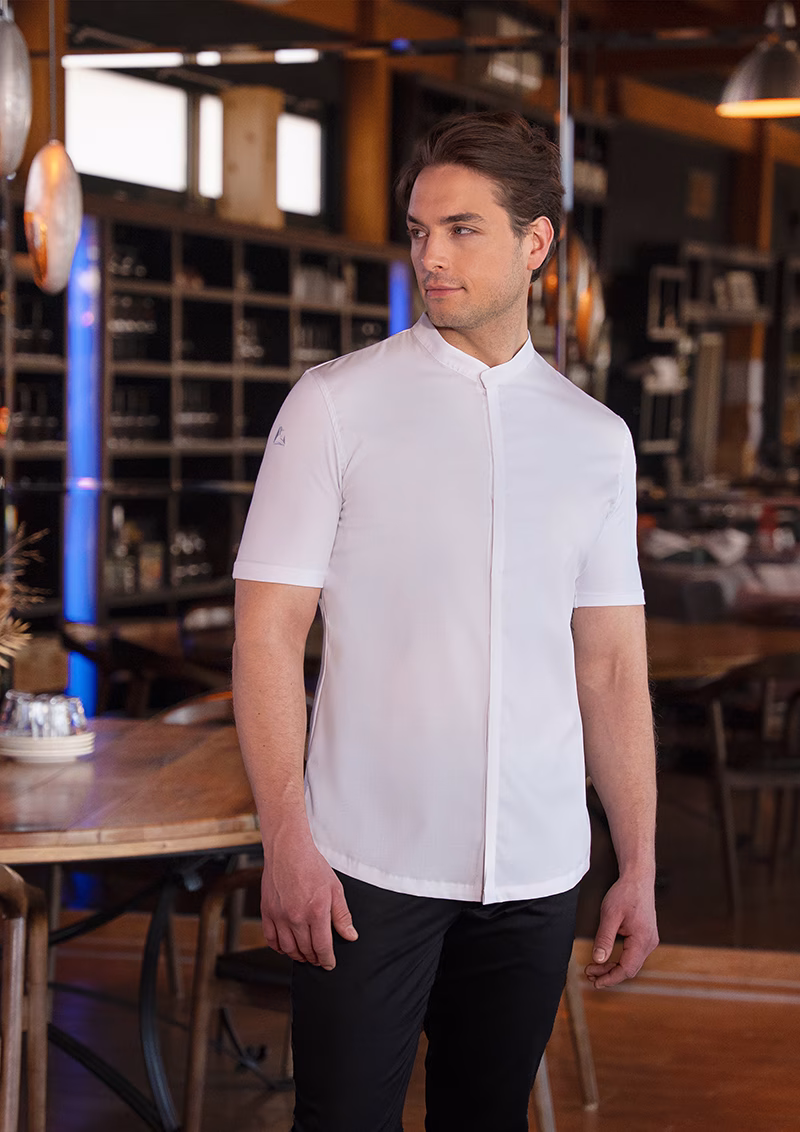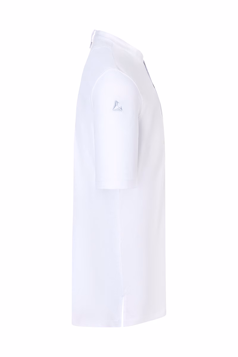 | hochwertige, elegante Herrenkochjacke mit kurzen Ärmeln und schlanker Silhouette