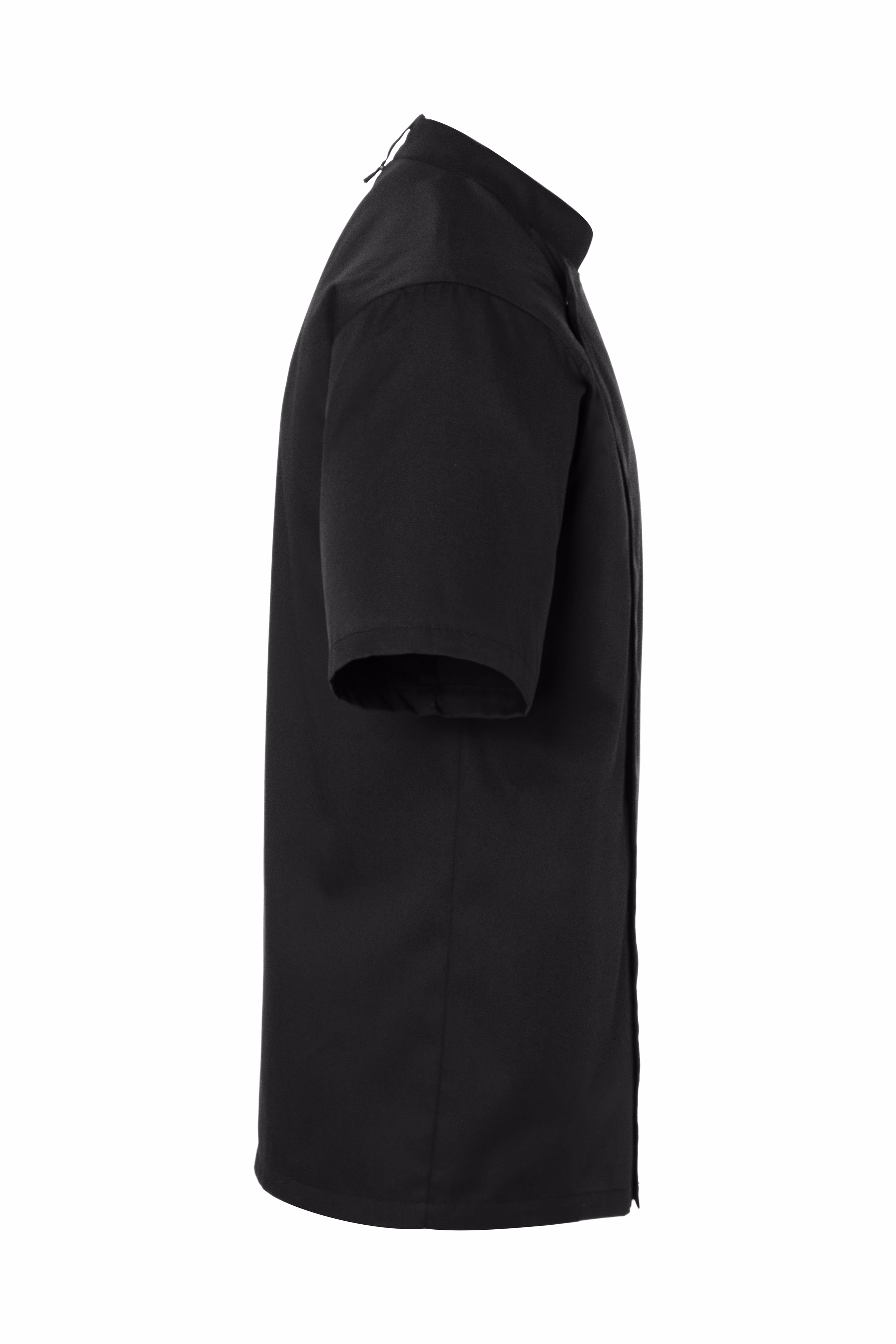 Die modern geschnittene Jacke zeichnet sich durch eine schlanke Silhouette mit leicht taillierter Passform aus, die Bewegungsfreiheit nicht einschränkt. Kurze Ärmel erhöhen den Tragekomfort bei hohen Temperaturen. Ein Stehkragen unterstreicht das gepflegte Erscheinungsbild und schützt zugleich vor unangenehmen Zugluft. Die verdeckte Knopfleiste mit robusten Druckknöpfen ermöglicht ein schnelles An- und Ausziehen – praktisch im hektischen Arbeitsalltag.