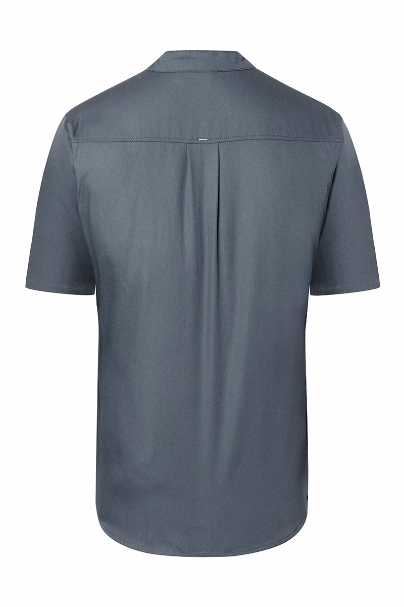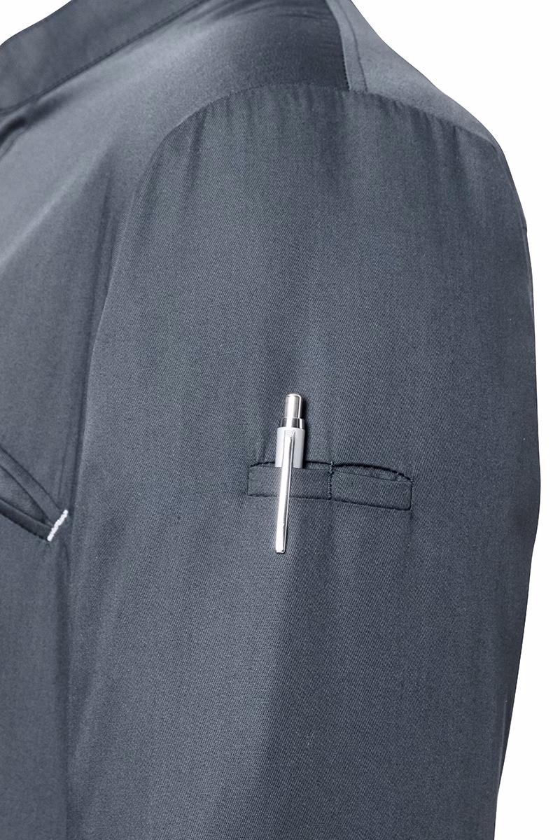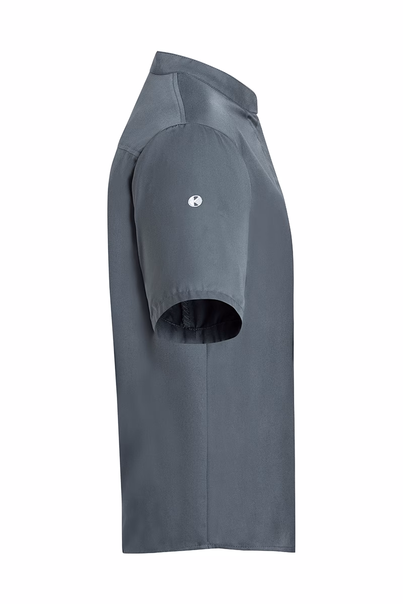 Die modern geschnittene Kochjacke besticht durch einen eleganten Stehkragen, der für eine gepflegte Optik sorgt. Die verdeckte Knopfleiste mit praktischen Druckknöpfen ermöglicht schnelles An- und Ausziehen sowie eine individuelle Belüftung. Kurze Ärmel bieten optimale Bewegungsfreiheit und verhindern Überhitzung während intensiver Arbeitsschichten. Eine elegante Brusttasche ergänzt die Ausstattung um eine praktische Aufbewahrungsmöglichkeit für kleine Utensilien. Zusätzlich befindet sich am linken Ärmel eine dezente Leistentasche (6 x 1 cm), ideal zum Verstauen von Stiften oder Thermometern.