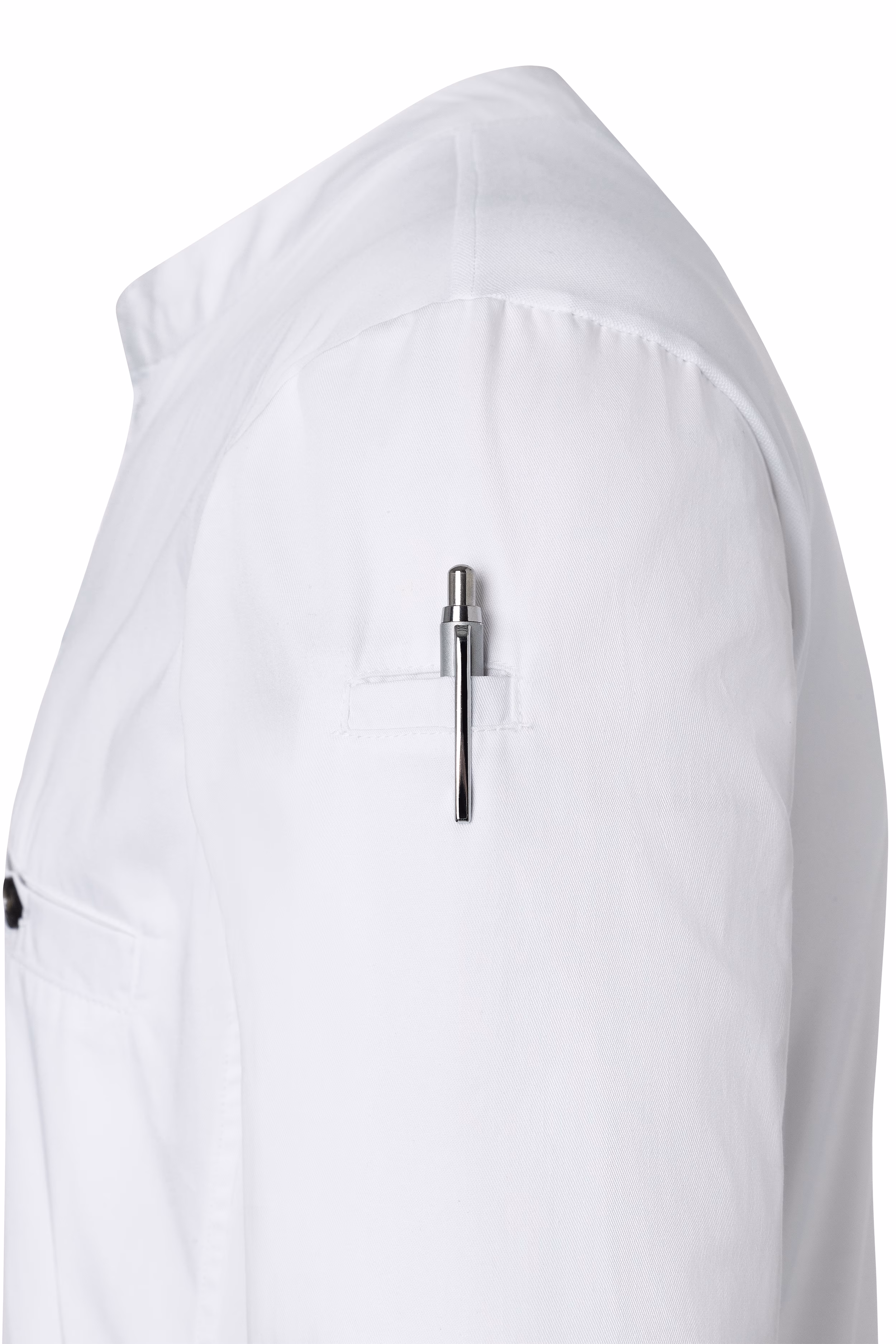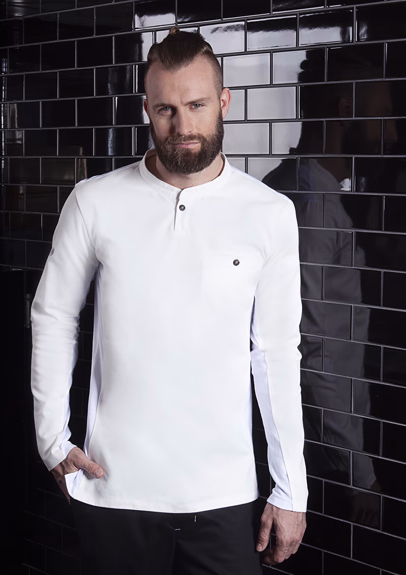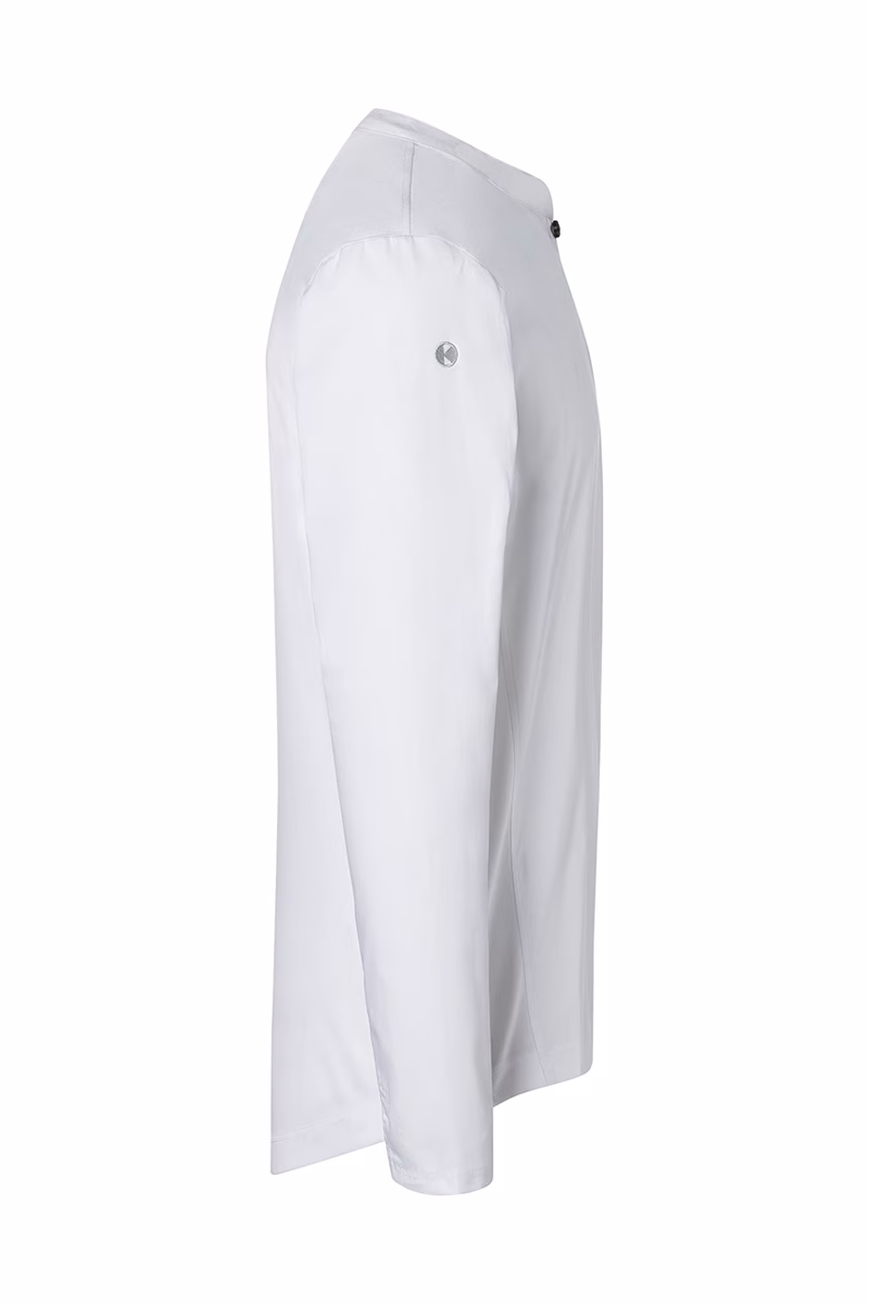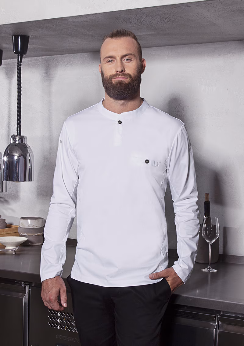 Der schmale Stehkragen mit kleiner Knopfleiste verleiht dem Shirt einen modernen Look und ermöglicht individuelle Anpassungen am Halsbereich. Praktische Taschen auf der Brust sowie am linken Ärmel bieten ausreichend Stauraum für kleine Utensilien, die Sie stets griffbereit benötigen. Die hohe Waschbarkeit bis 60 °C im Schonwaschgang garantiert eine einfache Reinigung auch bei hartnäckigen Verschmutzungen – ein entscheidender Vorteil in hygienisch sensiblen Bereichen.