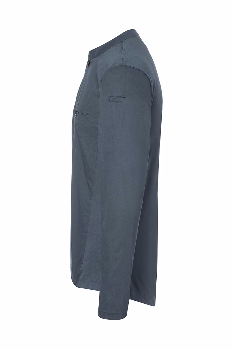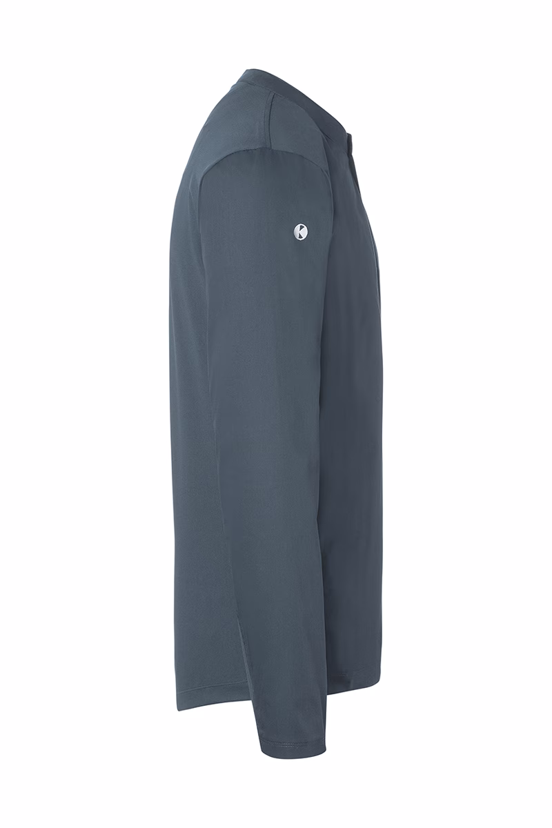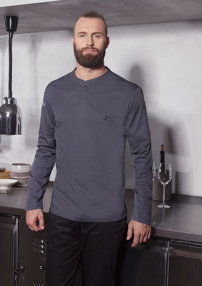 Der schmale Stehkragen mit kleiner Knopfleiste verleiht dem Shirt einen modernen Look und ermöglicht individuelle Anpassungen am Halsbereich. Praktische Taschen auf der Brust sowie am linken Ärmel bieten ausreichend Stauraum für kleine Utensilien, die Sie stets griffbereit benötigen. Die hohe Waschbarkeit bis 60 °C im Schonwaschgang garantiert eine einfache Reinigung auch bei hartnäckigen Verschmutzungen – ein entscheidender Vorteil in hygienisch sensiblen Bereichen.