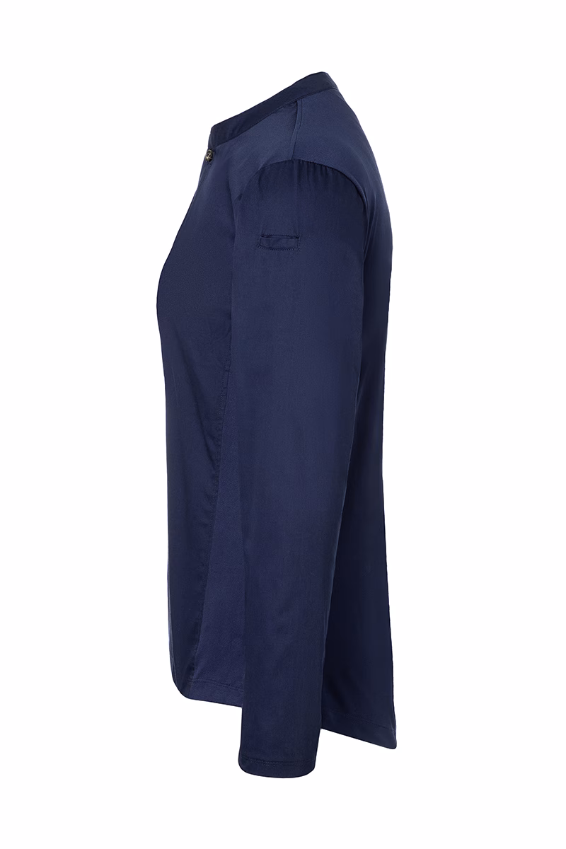 Das taillierte Slim-Fit-Schnittbild unterstreicht Ihre feminine Silhouette und sorgt für einen modernen Auftritt. Ein schmaler Stehkragen mit kleiner Knopfleiste verleiht dem Shirt eine stilvolle Note und ermöglicht zugleich eine individuelle Anpassung des Halsausschnitts. Besonders praktisch ist die Leistentasche am linken Ärmel, die kleine Utensilien sicher verstaut und stets griffbereit hält. Die sorgfältig verarbeiteten Nähte gewährleisten Langlebigkeit auch bei häufigem Waschen.
