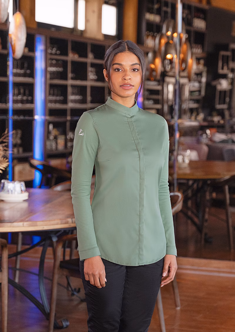 Die schlanke Slim-Fit-Passform betont Ihre Silhouette elegant ohne einzuengen. Ein stilvoller Stehkragen verleiht der Jacke eine moderne Note, während größenverstellbare Manschetten an den langen Ärmeln individuell angepasst werden können. Die verdeckte Druckknopf-Leiste ermöglicht ein schnelles An- und Ausziehen ohne optische Unterbrechungen. Praktisch ergänzt wird die Funktionalität durch eine Leistentasche am linken Ärmel – ideal für kleine Utensilien – sowie eine clevere Schlaufe am hinteren Kragen zum sicheren Fixieren einer Latzschürze, die ein Verrutschen verhindert.