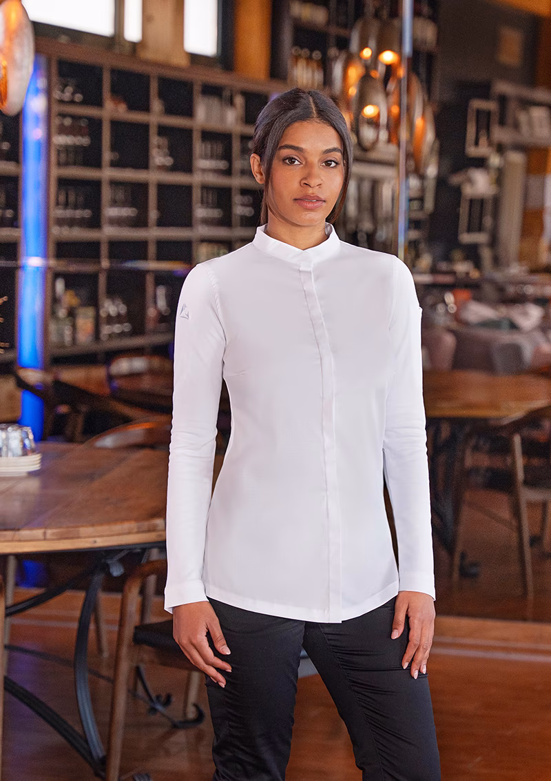 | hochwertige, elegante Damenkochjacke mit langen Ärmeln und schlanker Silhouette