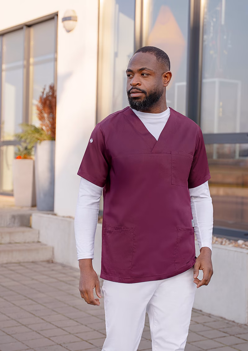 Der gerade geschnittene Regular-Fit garantiert eine zeitgemäße Silhouette ohne einzuengen. Der klassische Rundhalsausschnitt mit elastischem Halsbündchen passt sich flexibel an Ihren Nacken an und erhöht den Tragekomfort spürbar. Ein integriertes Nackenband sorgt zusätzlich für ein angenehmes Hautgefühl und verhindert Reibung – auch bei längeren Einsätzen. Taschen oder Verschlüsse sind bewusst nicht integriert, um eine klare, professionelle Optik zu bewahren.