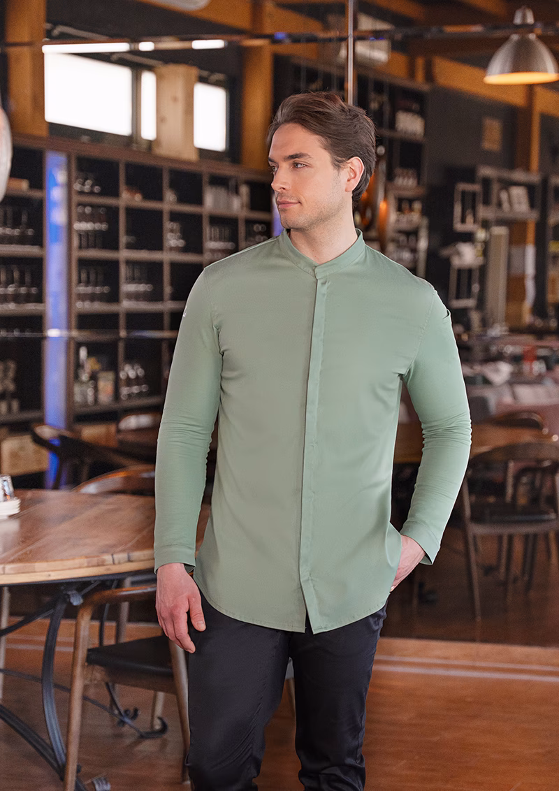 Der stilvolle Stehkragen unterstreicht die elegante Optik der Kochjacke, während größenverstellbare Manschetten an den Ärmeln für individuellen Sitz sorgen. Eine verdeckte Druckknopf-Leiste ermöglicht ein schnelles An- und Ausziehen ohne optische Störungen. Besonders praktisch ist die funktionelle Schlaufe am hinteren Kragen, die Ihre Latzschürze sicher hält und ein Verrutschen verhindert. Für wichtige Utensilien steht Ihnen eine dezente Leistentasche am linken Ärmel zur Verfügung.