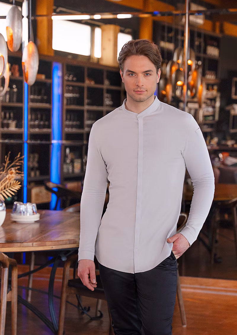 Der stilvolle Stehkragen unterstreicht die elegante Optik der Kochjacke, während größenverstellbare Manschetten an den Ärmeln für individuellen Sitz sorgen. Eine verdeckte Druckknopf-Leiste ermöglicht ein schnelles An- und Ausziehen ohne optische Störungen. Besonders praktisch ist die funktionelle Schlaufe am hinteren Kragen, die Ihre Latzschürze sicher hält und ein Verrutschen verhindert. Für wichtige Utensilien steht Ihnen eine dezente Leistentasche am linken Ärmel zur Verfügung.
