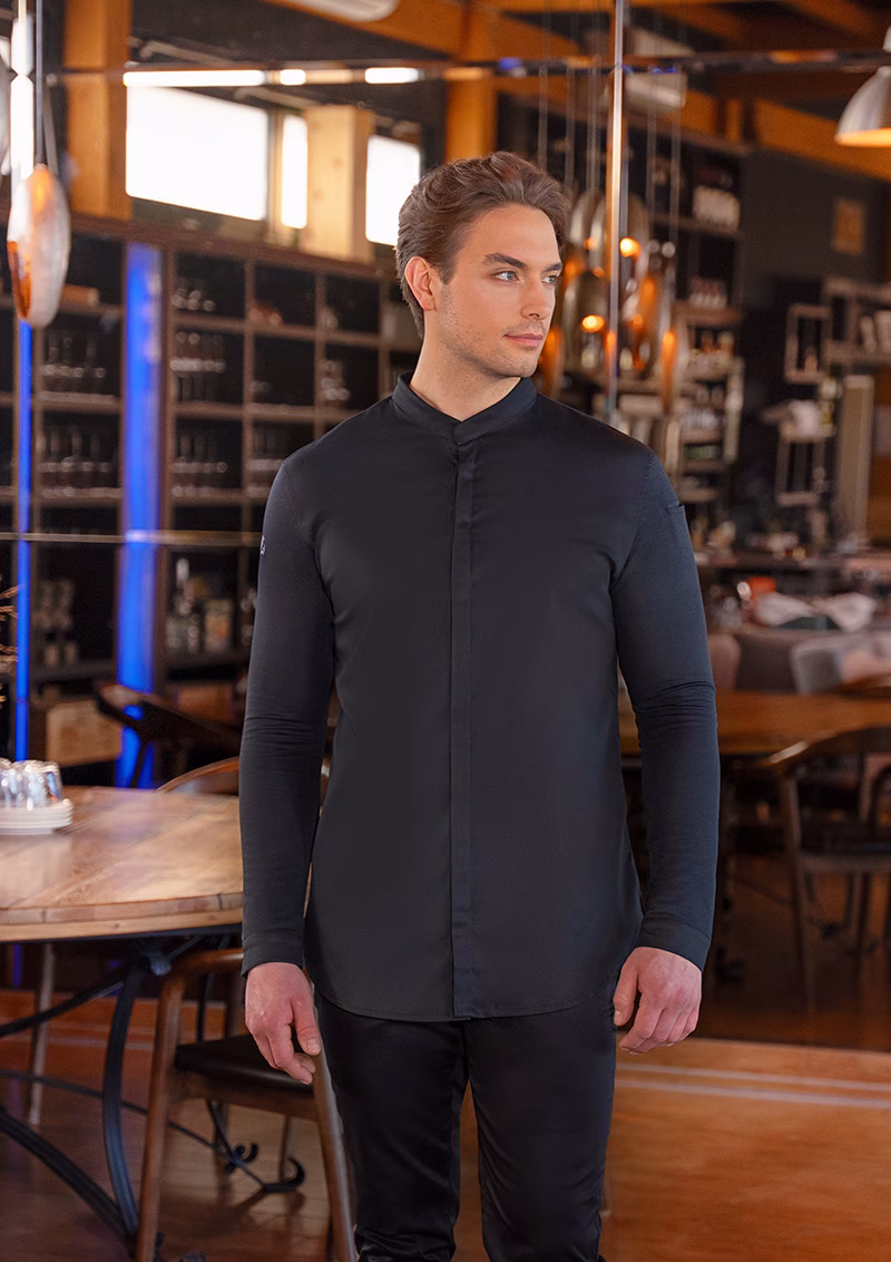| hochwertige, elegante Herrenkochjacke mit langen Ärmeln und schlanker Silhouette