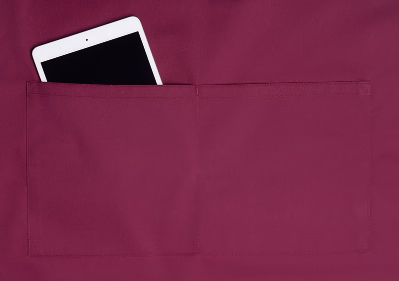 Die Latzschürze misst 75 x 90 cm (Breite x Länge) und bietet damit einen großzügigen Schutz vor Verschmutzungen. Eine aufgesetzte Tasche mit zwei separaten Fächern (40 x 20 cm) ermöglicht das sichere Verstauen von Utensilien wie Stiften oder kleinen Werkzeugen, die im Service oder Salonalltag schnell griffbereit sein müssen. Die Nähte sind sorgfältig gesichert, um eine lange Lebensdauer auch bei häufigem Waschen zu gewährleisten.