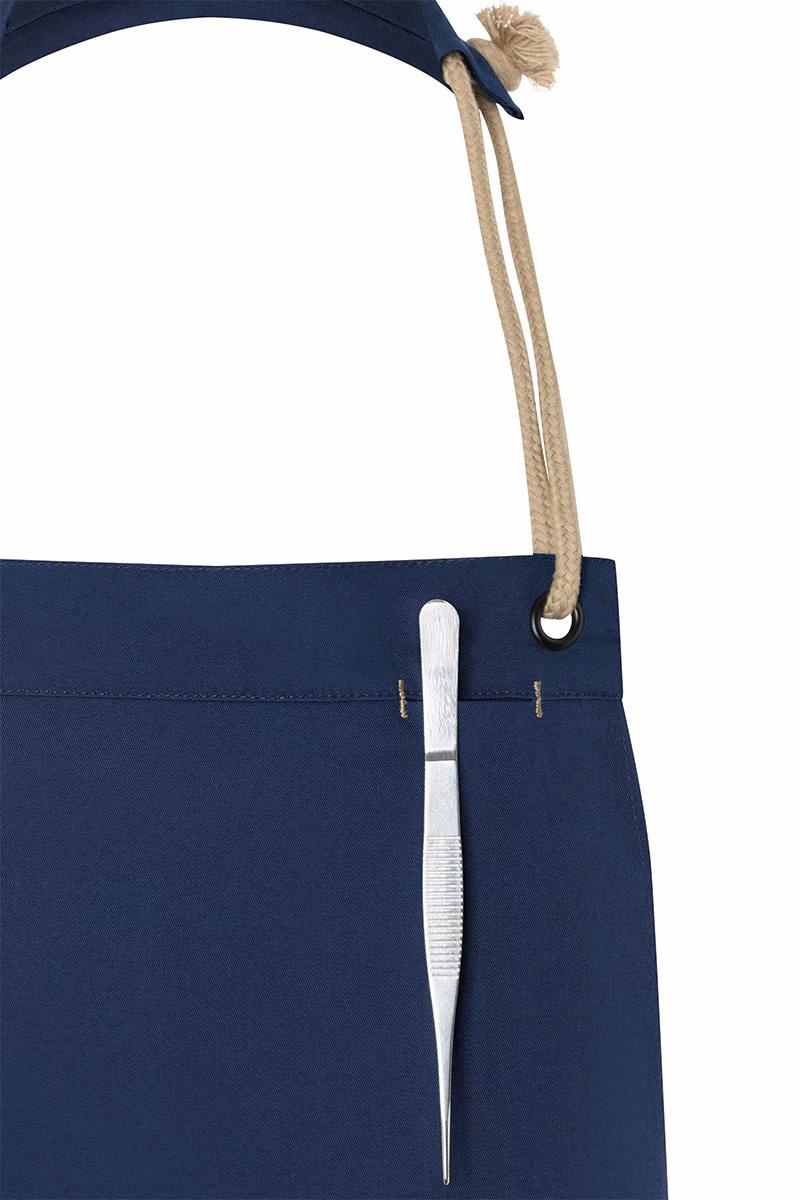 Die Latzschürze misst 70 x 85 cm und bietet damit großzügigen Schutz bei gleichzeitiger Bewegungsfreiheit. Die Taillen- und Latzbänder aus kontrastfarbigen Kordeln lassen sich individuell binden und garantieren so einen sicheren Sitz, der sich flexibel an Ihre Körperform anpasst. Eine praktische Leistentasche auf Brusthöhe bietet Platz für Stifte oder Gastropinzetten – damit Sie wichtige Utensilien stets griffbereit haben. Kontrastnähte an der Tasche unterstreichen den natürlichen Look und verleihen der Schürze eine moderne Note.
