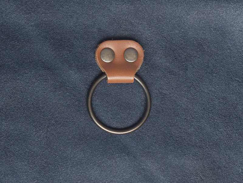 | cognacfarbiges Lederband an rechter Vorderseite zum Befestigen eines Kassierhalfters oder Küchentuchs