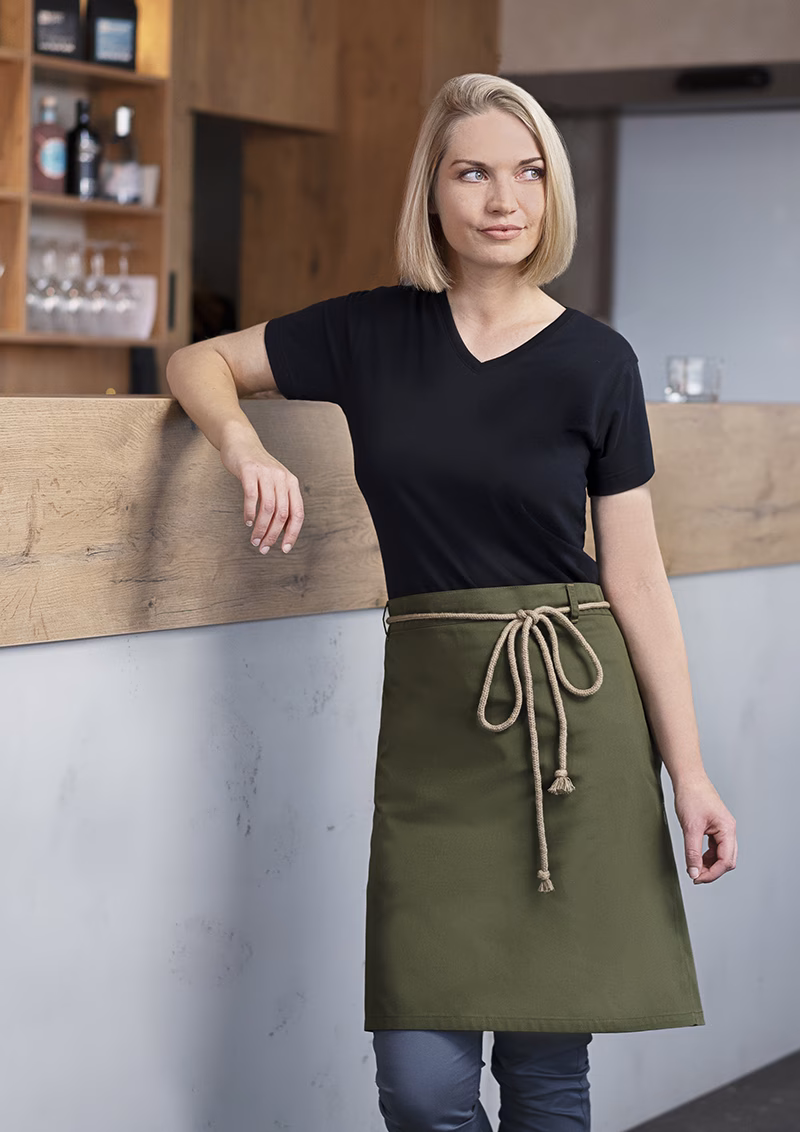 Das robuste Köpergewebe aus 65 % recyceltem Polyester und 35 % Baumwolle sorgt für eine angenehme Haptik bei gleichzeitig hoher Strapazierfähigkeit. Mit einem Flächengewicht von 215 g/m² bietet der Vorbinder ausreichend Stabilität, ohne die Bewegungsfreiheit einzuschränken. Die sorgfältige Verarbeitung garantiert einen formbeständigen Sitz auch bei häufigem Tragen und Waschen. Dank der Pflegeeigenschaften ist der Vorbinder bei bis zu 60 °C waschbar und bleibt dabei farbecht sowie formstabil.