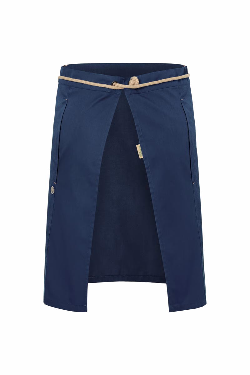 Der Vorbinder verzichtet bewusst auf Taschen zugunsten eines klaren, urbanen Designs. Innovative seitliche Eingriffe ermöglichen Ihnen dennoch leichten Zugriff auf Ihre Hosentaschen – so behalten Sie alle wichtigen Utensilien stets griffbereit. Die Taillenbänder aus kontrastfarbenen Kordeln sorgen nicht nur für einen sicheren Halt, sondern setzen zugleich natürliche Akzente im Design. Zwei zusätzliche Schlaufen am oberen Bund erleichtern das Binden und garantieren eine individuelle Anpassung an Ihre Körperform.