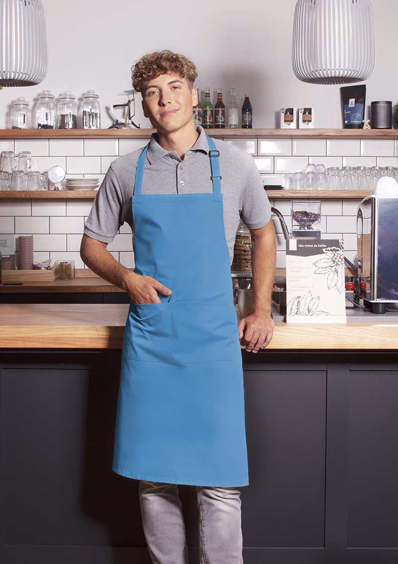 The bib apron measures 75 x 90 cm (width x length), offering generous protection against dirt. A patch pocket with two separate compartments (40 x 20 cm) allows you to safely store utensils such as pens or small tools that need to be quickly accessible in everyday service or salon work. The seams are carefully secured to ensure a long service life even with frequent washing.