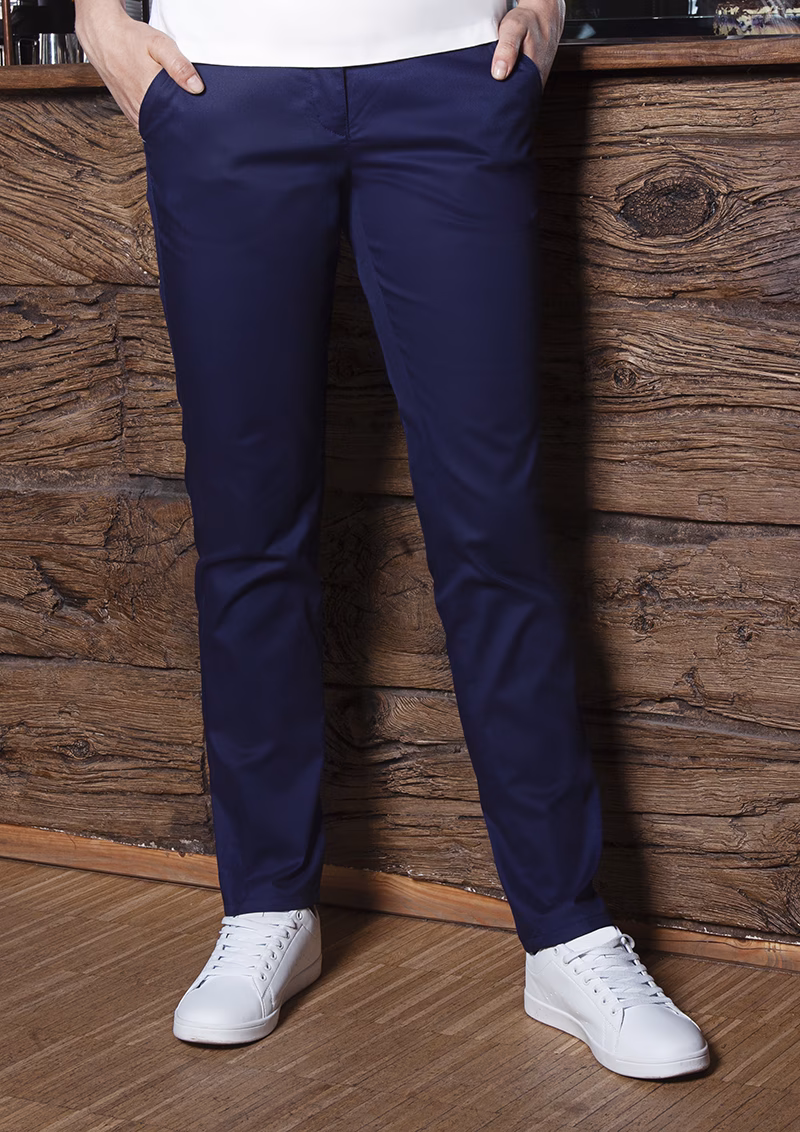 | casual work trousers for women made from light stretch fabric for exceptional freedom of movement | close-fit cut | combines the modern design of chinos with the comfortable elements of joggpants | versatile applications in the following areas: kitchen, service, cleaning, care, wellness and much more | high washability against stubborn stains | also a perfect companion for everyday use in addition to work | flexible elastic band and cord in the waistband for a comfortable fit in the hip area | narrow hem | 2 side pockets and 2 back pockets with buttons | includes belt loops | matching article: Men's Chino Trousers - HM 10 (manufacturers article number)