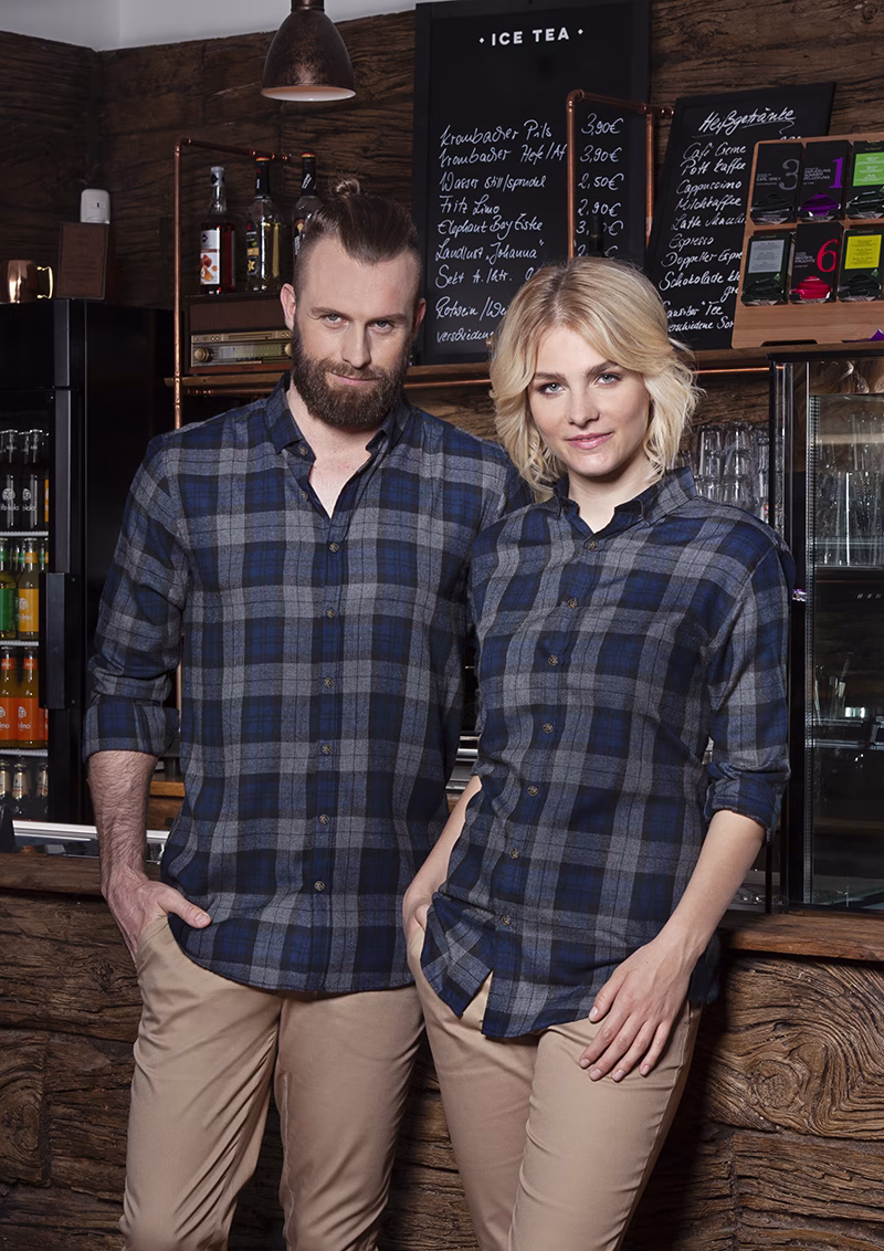 With the Urban Style men's check shirt, you can count on a successful combination of classic charm and modern streetwear flair. The shirt impresses with its trendy navy check pattern, which gives your appearance in the catering, hotel, and service industries a fresh, contemporary touch. The tailored slim fit ensures an elegant silhouette and underlines your professional charisma.